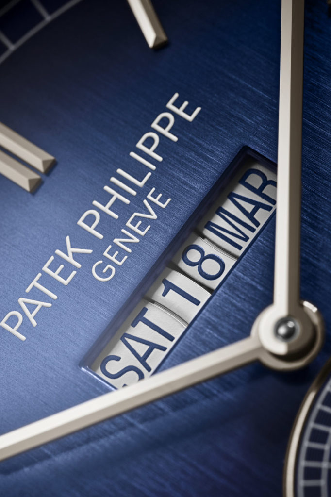 For the new Ref. 5236P-001, this watch presents an innovative indication of the day, date, and month in an elongated aperture at 12 o’clock. A panoramic aperture of this kind is not totally unprecedented in the manufacture’s collections.