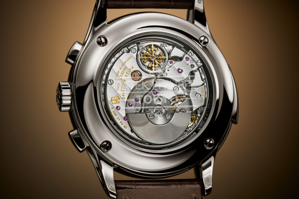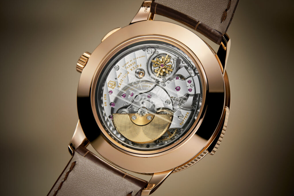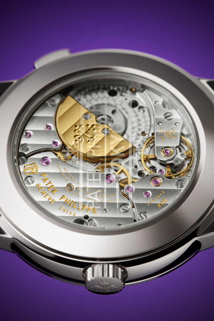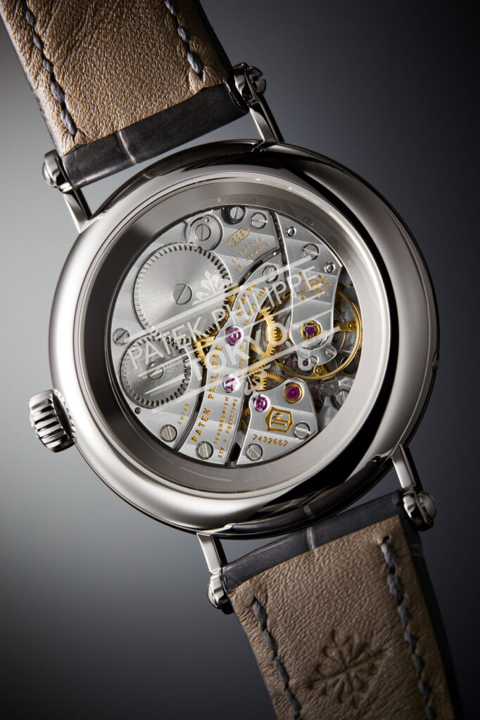The watch is delivered with two interchangeable case backs: one in sapphire crystal adorned with the transfer-printed inscription “Patek Philippe Tokyo”, the other in solid platinum engraved with the same wording.