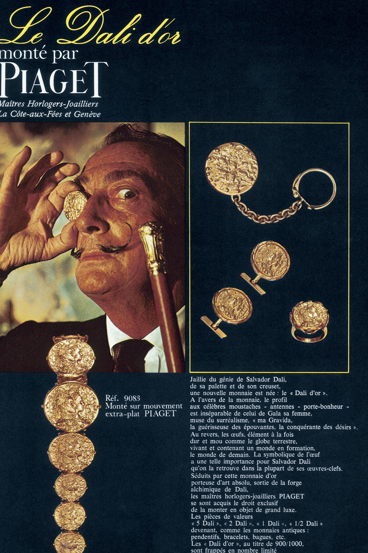 These were the years under the ‘Piaget watchmaker-jeweller’ banner, as production focused only on cases made of precious metals, with an unparalleled mastery of gold and platinum working techniques that allow to create bracelets of astounding flexibility and with the introduction of diamonds and dials in hard stones (lapis lazuli, onyx, tiger’s eye, opal, jade, coral and malachite), part of the – ingenious – move of building up on the ‘jewellery-watch’, also thanks to the 21st Century collection. The international jet-set just went crazy, and the term ‘Piaget Society’ was born, identifying the glittering luxury-hippie spirit of artists, musicians, models, actors and stylists who made up its elite clientele. Piaget watches were seen on the wrists of both Jackie Kennedy and Andy Warhol, and a creative relationship with Salvador Dali was established for the Dali d’Or: a coin minted with the artist’s name, in his endeavor to incarnate more and more a living work of art himself.
