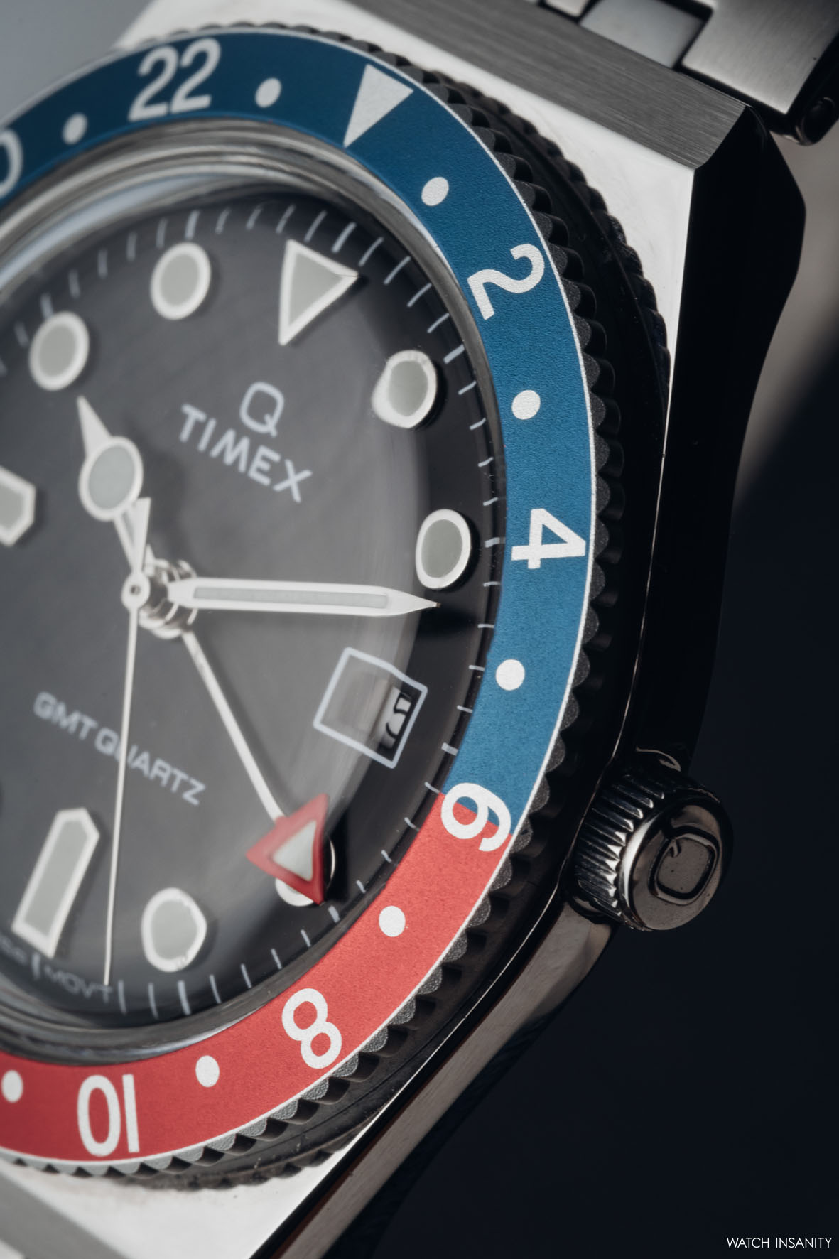 Another feature that brings the Q Timex Diver GMT straight back to the 70s is the domed acrylic crystal that protrudes 2.7mm above the bezel, so quite thin, as it stands at around 12mm. Unlike the 1979 model, which was not a GMT and was a day date, Timex here chose to keep the single date window, with only the day of the month.