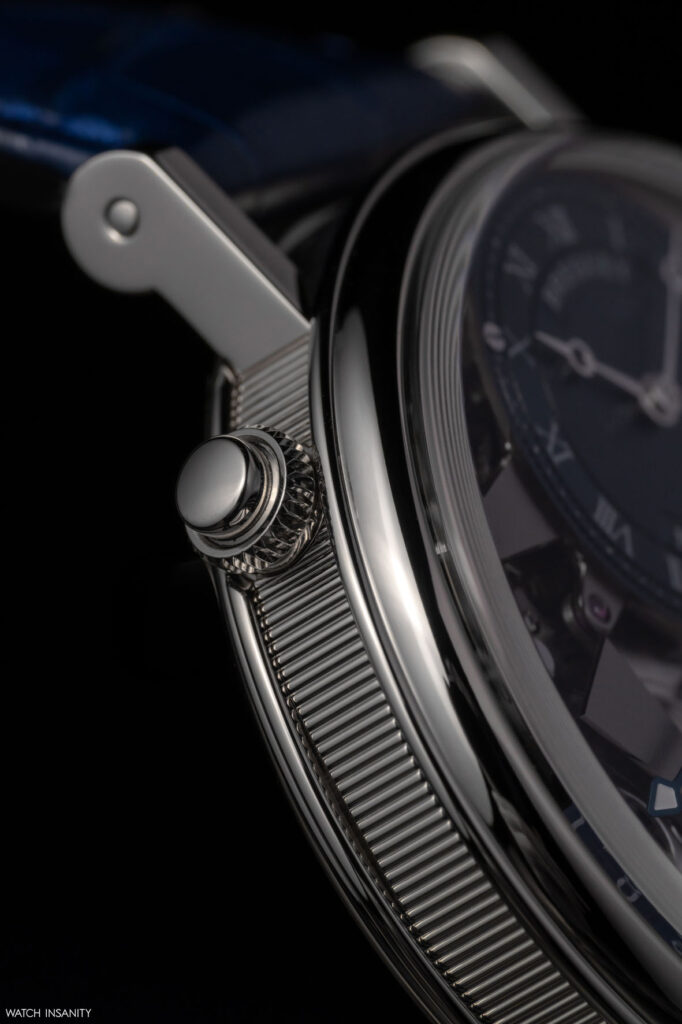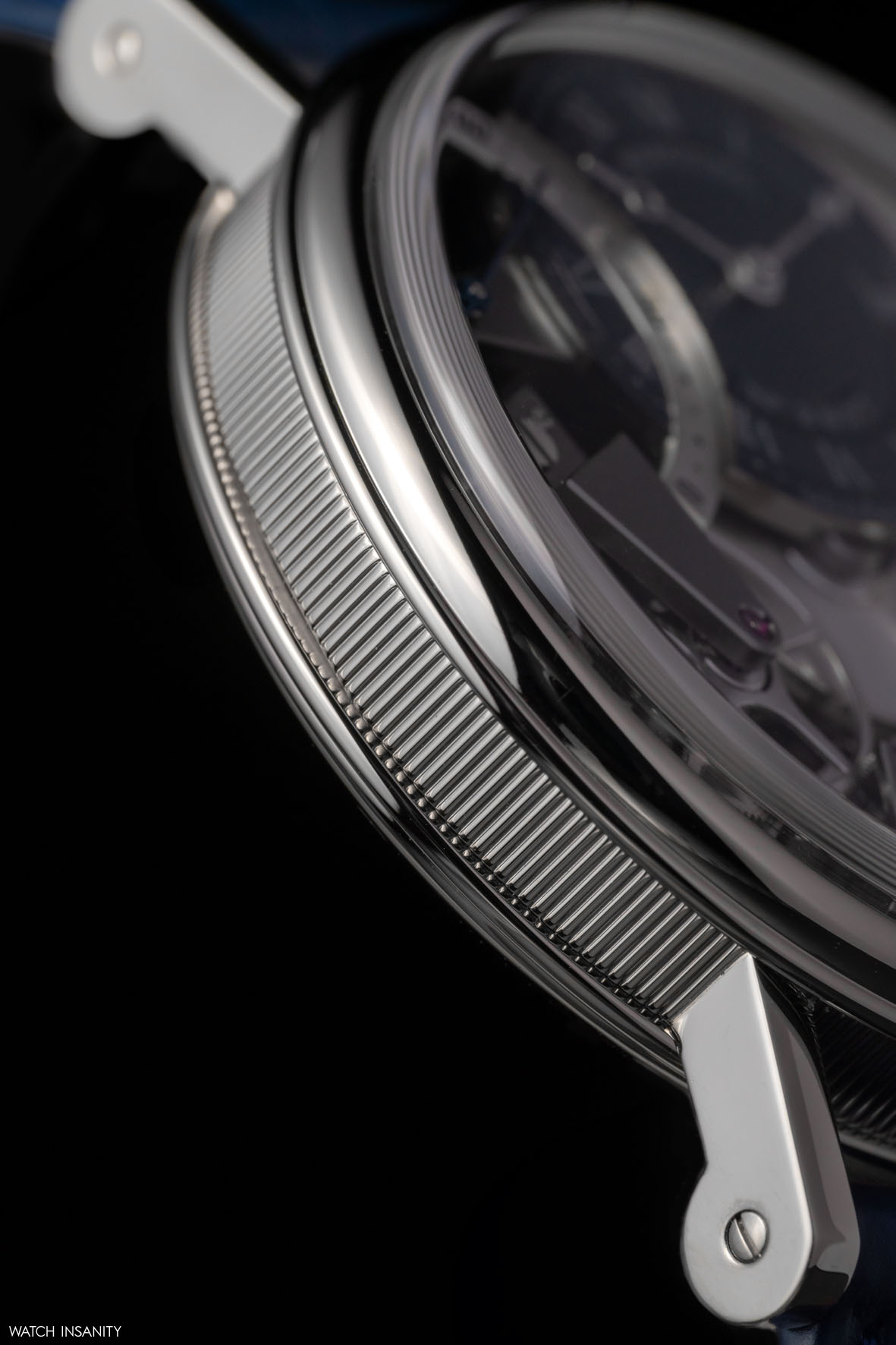 The case is made of white gold, measuring 40 mm in diameter by 11.8 mm in thickness, and has the classic ‘coin’ knurled finish on the sides. The bezel is practically non-existent, allowing a full view of the dial and all the movement elements. Characteristic of the Tradition collection are the very elongated lugs, polished like most of the case, which make the watch comfortable on wrists that are not too thin, despite the small diameter.