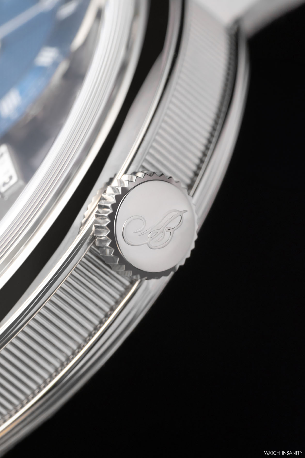 The retrograde date scale, with the indicator returning to the beginning of the month (1) once it reaches the end (31), placed on the dial at 6 o’clock, creates a great balance. It fits perfectly into the profile of the case at the bottom without obstructing the view of the movement. The colour is the same blue as that of the dial, with contrasting silvered hour markers.