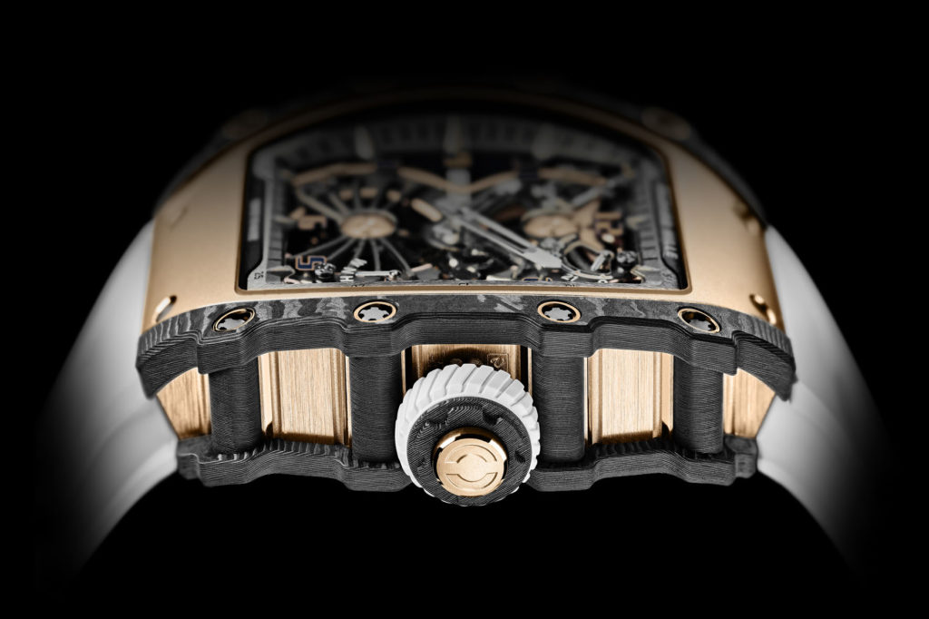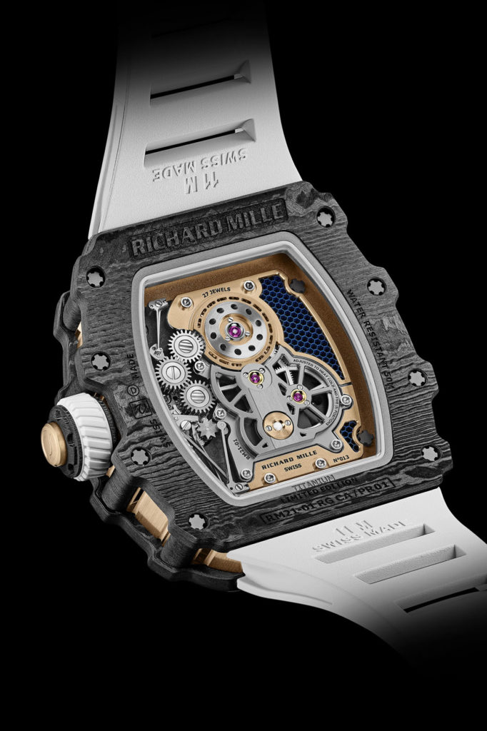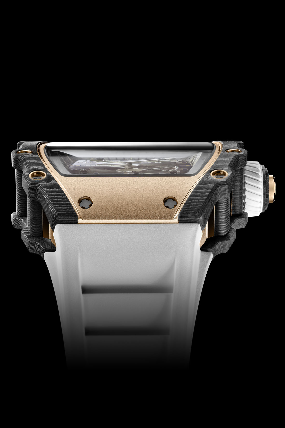 The sapphire glass dial provides a flawlessly transparent window into the manual-winding Calibre RM21-01. The power-reserve indicator is placed in lieu of the number at 11 o’clock, while the torque indicator occupies the 1 o’clock position. The latter makes it possible to immediately know the barrel- pring’s tension and thus optimise the movement’s functioning. At 4 o’clock sits the function selector, operated by a pusher integrated into the centre of the crown, which is crafted in Carbon TPT and 5N red gold with a gasket in the same material as the white rubber bracelet. In a manner similar to a car’s gearbox, a simple push of the button located in the centre of the crown switches the watch from the Neutral (N) position to Winding (W) to Hand-Setting (H).