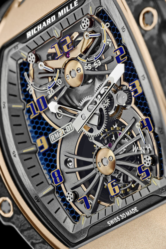 With the RM 21-01, Richard Mille presents a new case design. The complex structure of the case in 5N red gold is reinforced with an exoskeleton in Carbon TPT, used for the bezel and pillars. This extremely light and durable composite is made by stacking hundreds of layers of carbon fibres thanks to an automated process that rotates 45° between each layer, then heated to 120° in an autoclave before being machined to the nearest micron. Just like armour, these reinforcements perfectly protect the case, and are firmly held in place by 20 spline screws. The striking appearance of Carbon TPT layers perfectly complements the gleam of gold and the royal blue honeycombed motif of the baseplate.