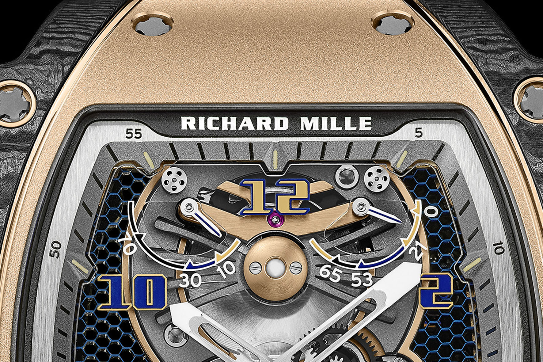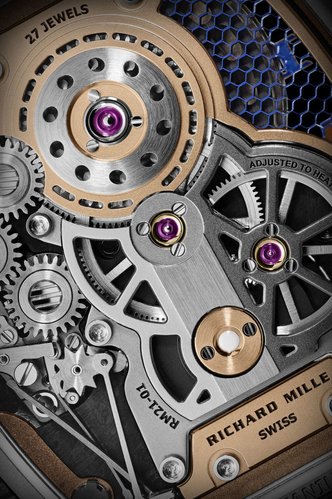 Carbon TPT is found at the heart of the baseplate, this time combined with an orthorhombic honeycomb structure embodying the concept of air itself and made of HAYNES 214 with a blue PVD treatment, a first for the brand. This nickel-chromium-aluminium-iron alloy is primarily intended for use in thermal environments exceeding 955°. Optimal resistance to high-temperature oxidation makes this material—which can nonetheless be moulded and assembled by conventional methods—an especially suitable choice for combustion chambers. Consequently, the RM 21-01’s baseplate offers unsurpassed stiffness, an extre-mely low thermal expansion coefficient and exceptional torque resistance, all essential prerequisites for a Richard Mille watch.