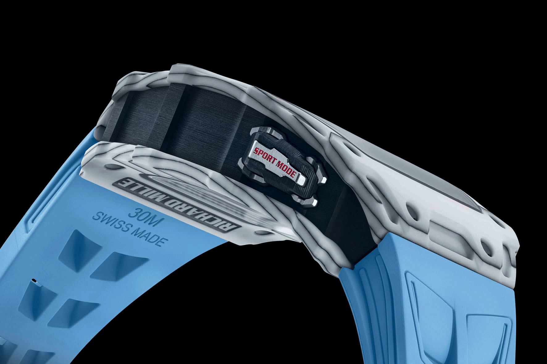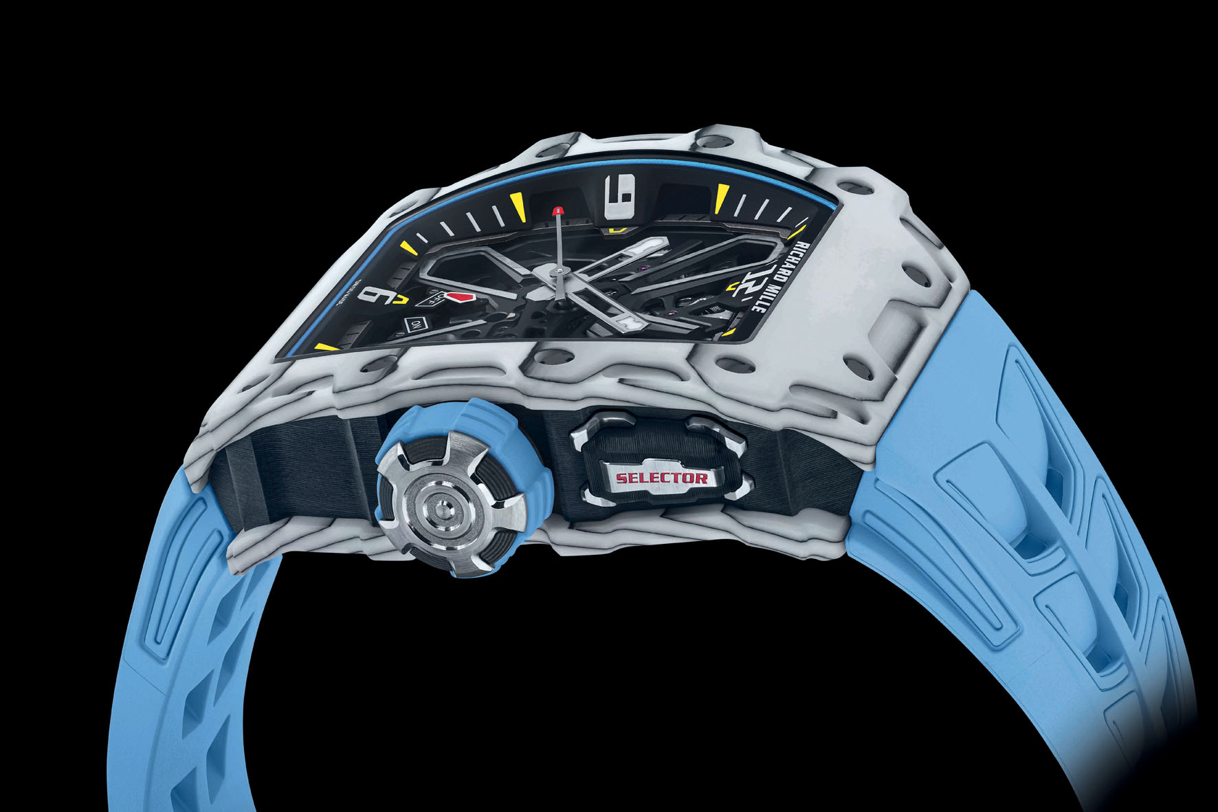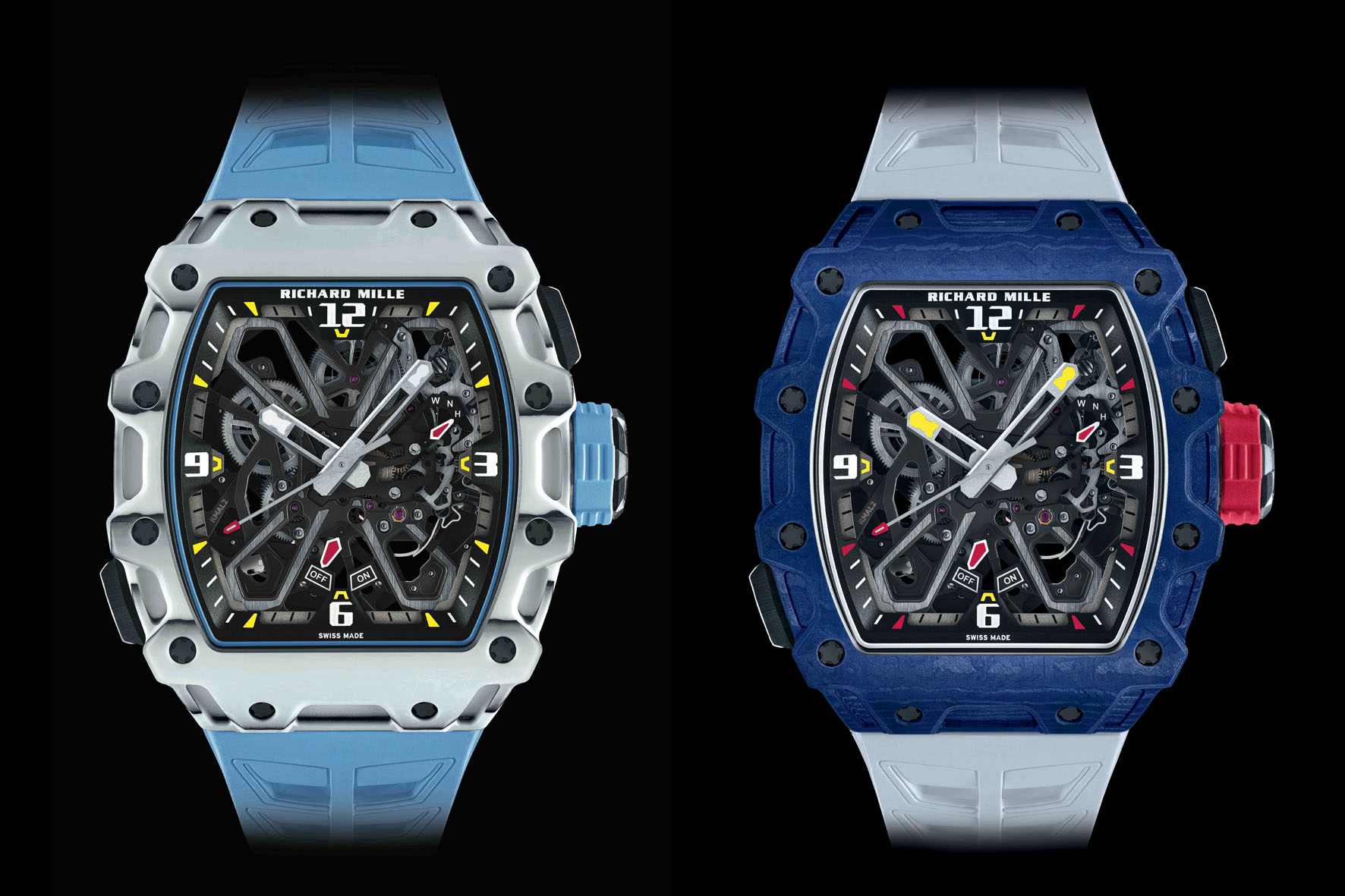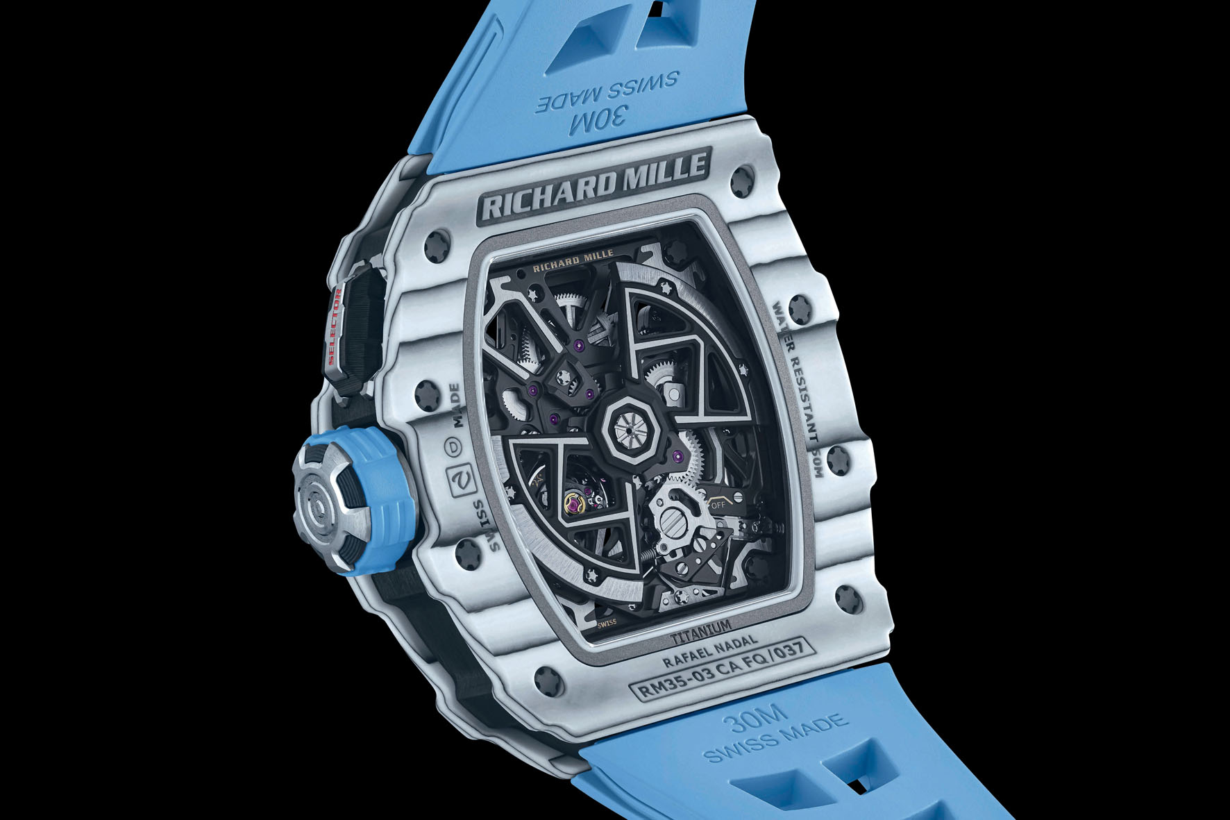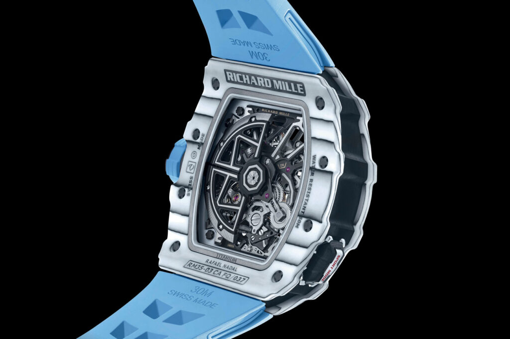 The new RM 35-03 is available in two versions at the price of 220,000 USD – blue Quartz TPT with a white Quartz TPT caseband and white Quartz TPT and Carbon TPT with a Carbon TPT caseband – that display cut-outs inspired by the RM 27-04 Tourbillon Rafael Nadal. Entirely skeletonised, the movement can be admired from both sides thanks to sapphire crystals on the front and back. The baseplate and bridges, crafted of grade 5 titanium with a grey electroplasma and PVD treatment, further accentuate the bold visual statement of this watch. The openwork hands sweep along the outer flange, also in microblasted grade 5 titanium, punctuated with the numbers 3, 6, 9 and 12 and slanted inward towards the movement to enhance depth.