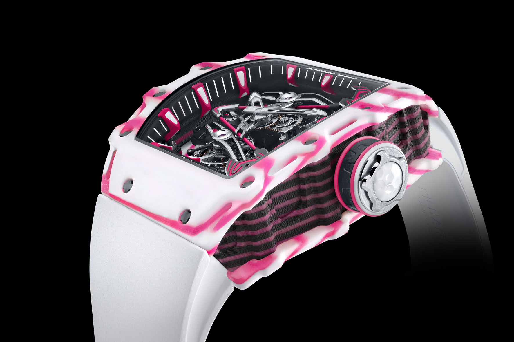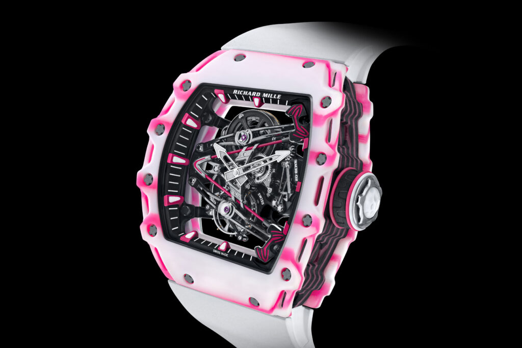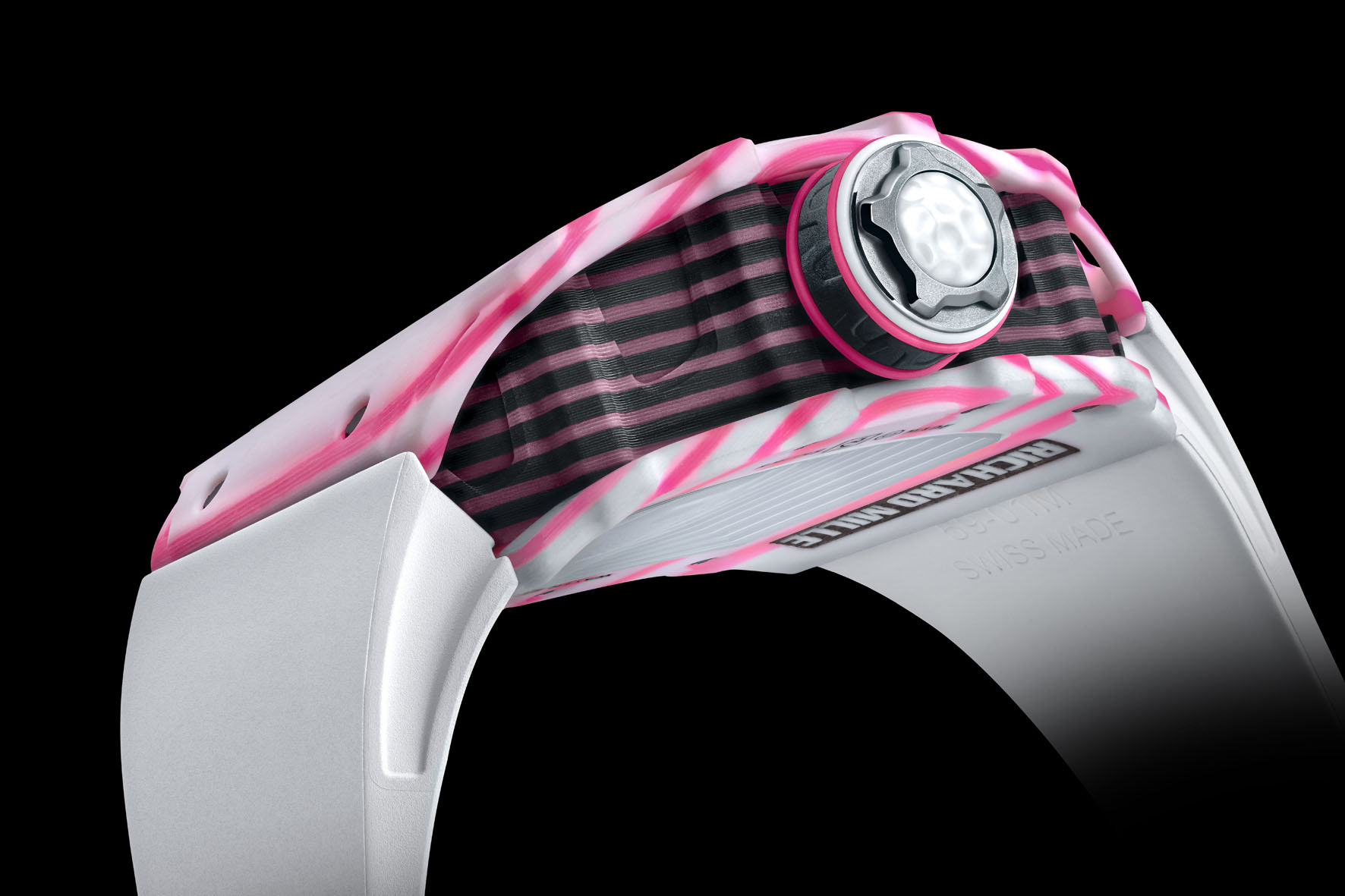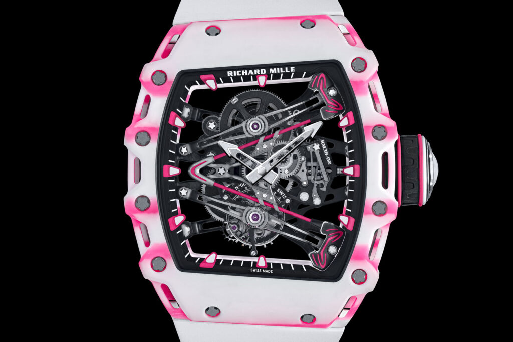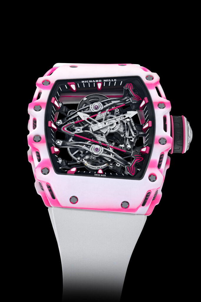 Pink it is. There is no question about that but that the new RM 38-02 Tourbillon Bubba Watson fits the brief. Inside and out, the watch and even the case are made of a unique pink Quartz TPT, white Quartz TPT and Carbon TPT, to match Bubba’s personality. The association of different colours and materials without merging them was a real technical challenge.