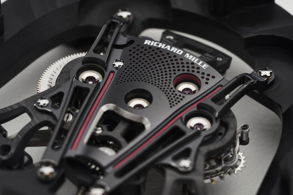Inspired by the audacity of the previous calibres signed Bubba Watson and by his ‘lucky’ colour, the RM 38- 02 is built around a baseplate in Carbon TPT, which comprises many layers of parallel carbon filaments. This material, omnipresent in the RM 38-02, is very demanding in terms of machining, both because of its hardness and because of the skeletonisation it is subjected to. As for the entire watch, many extensive tests were carried out on the baseplate to ensure that its skeletonisation in no way affected its mechanical properties.