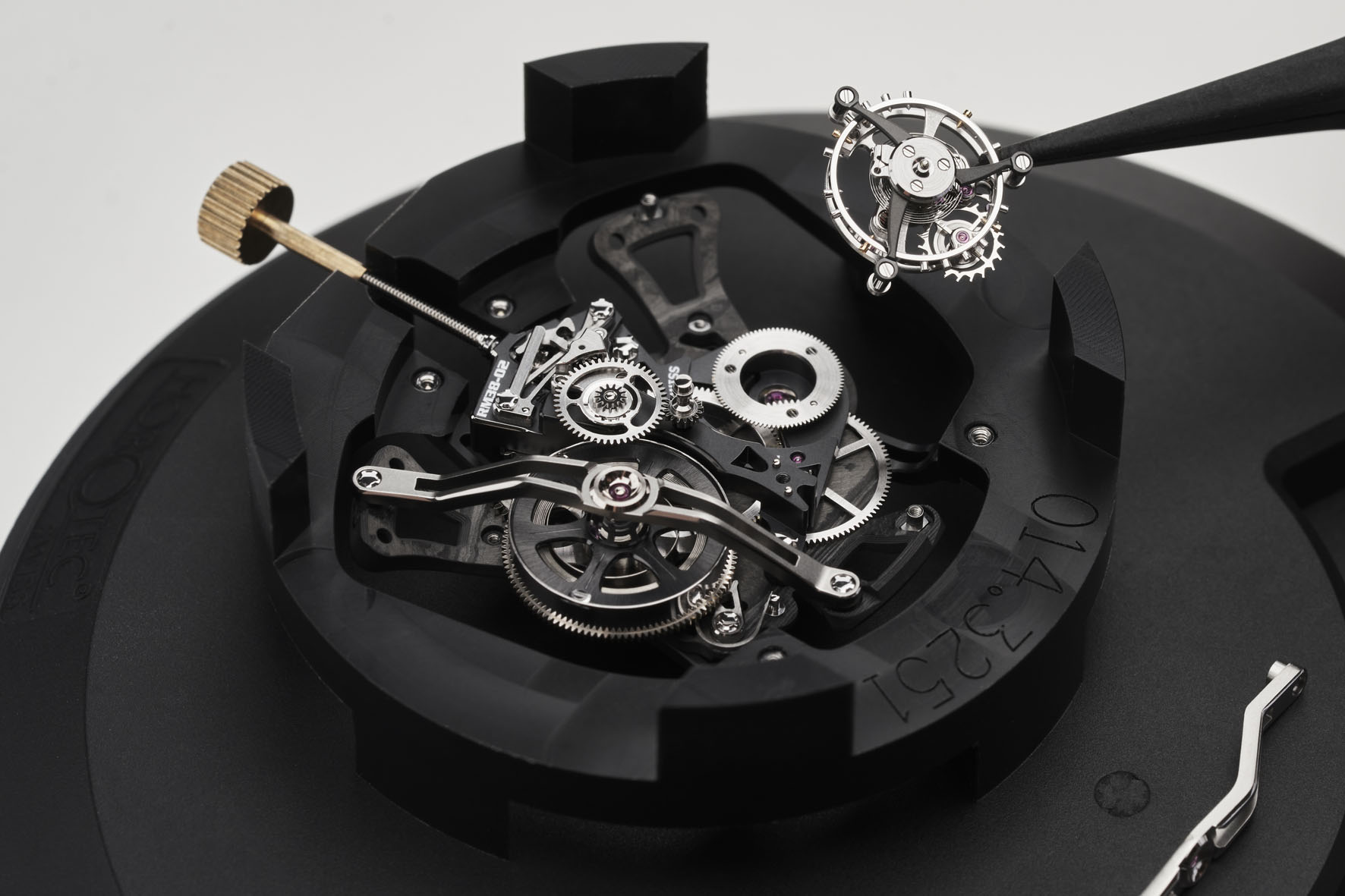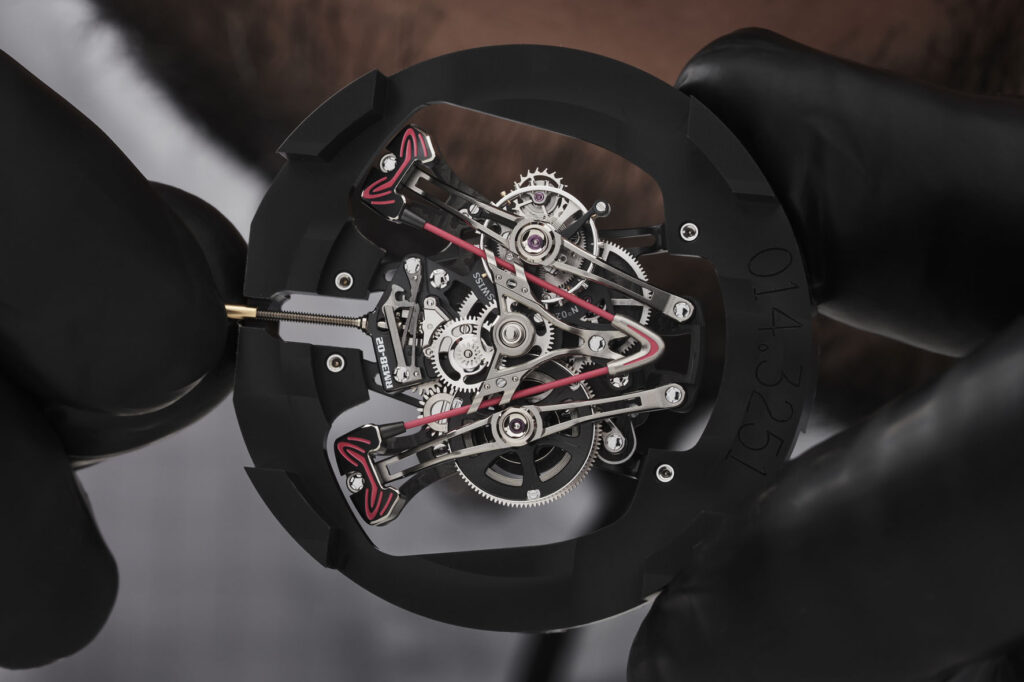 The baseplate supports grade 5 titanium bridges giving the movement powerful dynamics. They firmly maintain the involute gear wheels and the tourbillon fitted with a variable-inertia balance wheel. The open-work bridge incorporates two tubes that pass through the movement on either side. In grade 5 titanium and hand painted in the coveted pink colour, they further accentuate the general lines of the calibre. The colour is a nod to Bubba’s iconic Ping driver, and brings subtle touches of pink inside the movement. This colour is also present on the back of the calibre on a monumental micro-perforated bridge, echoing the pattern on the of Bubba’s driver when competing. The assembly of these PVD-treated bridges does not allow the watchmaker even the slightest of error. A clumsy gesture, the merest scratch on a part, and the component is simply binned.