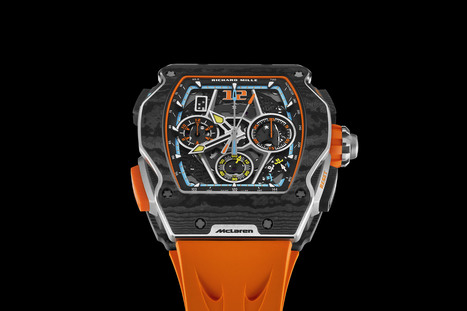 Wrapping around the automatic split-seconds chronograph movement of the watch just as the W1’s swooping bodywork cocoons its engine and occupants, the 43.84 x 49.94 x 16.19 mm Carbon TPT case of the RM 65-01 McLaren W1 was inspired by the car’s design features.