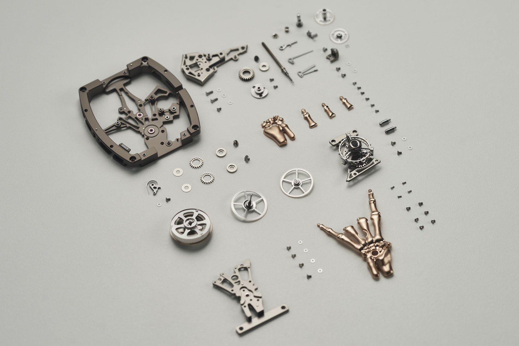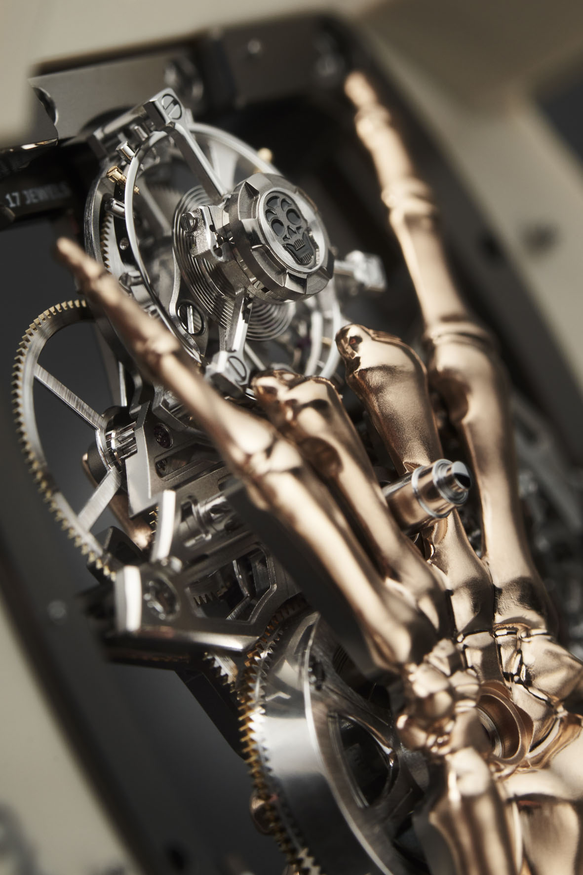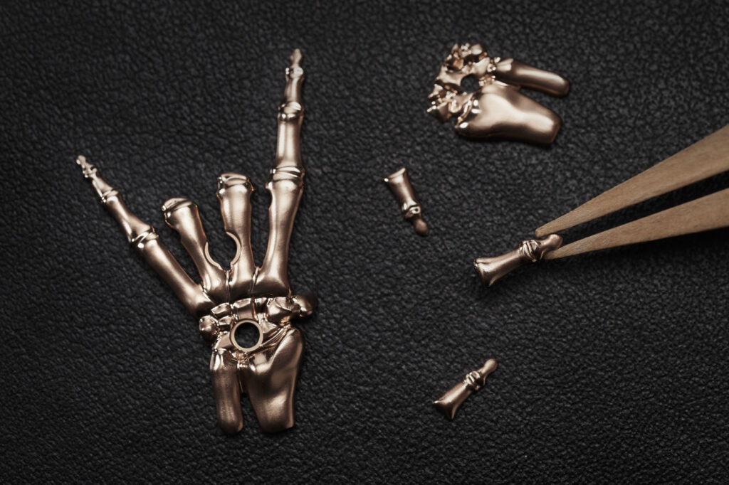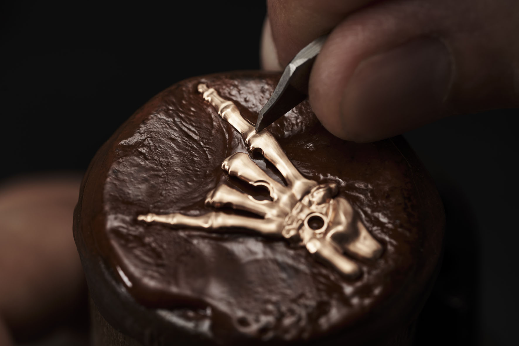 The horns gesture is represented by outstretched index and little fingers, whilst the last phalange of the thumb holding the middle and ring fingers are visible from the back of the watch. For this model, conceived by the Creative and Development Director Cécile Guenat, the five digits of the hand were first milled, then transferred to the master engraver to be perfected by hand. The task of craftmanship was entrusted to Genevan engraver Olivier Vaucher. The protracted and meticulous work of deburring and polishing brings out the contours of the bones and highlights the delicate joints with their microblasted finish.