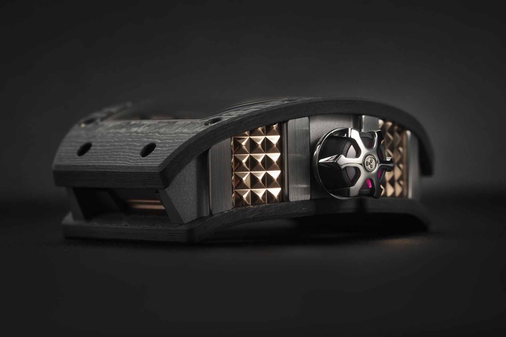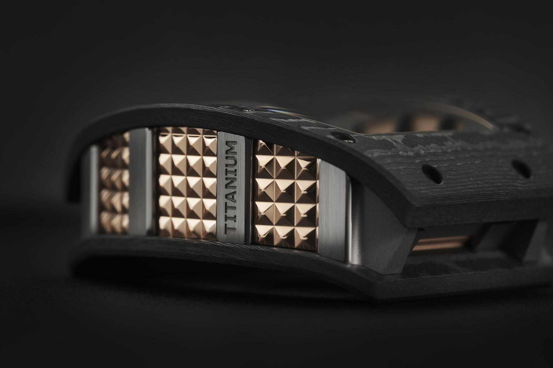 The case plays on the contrast between the apparent roughness of Carbon TPT® and the precious sheen of gold. On the grade 5 titanium caseband with satin-finished pillars and polished bevels, 5N red gold plates are inserted. These plates feature a ‘clou de Paris’ pattern, ground down after machining, then hand-polished to restore the sharp edges characteristic of punk belts.