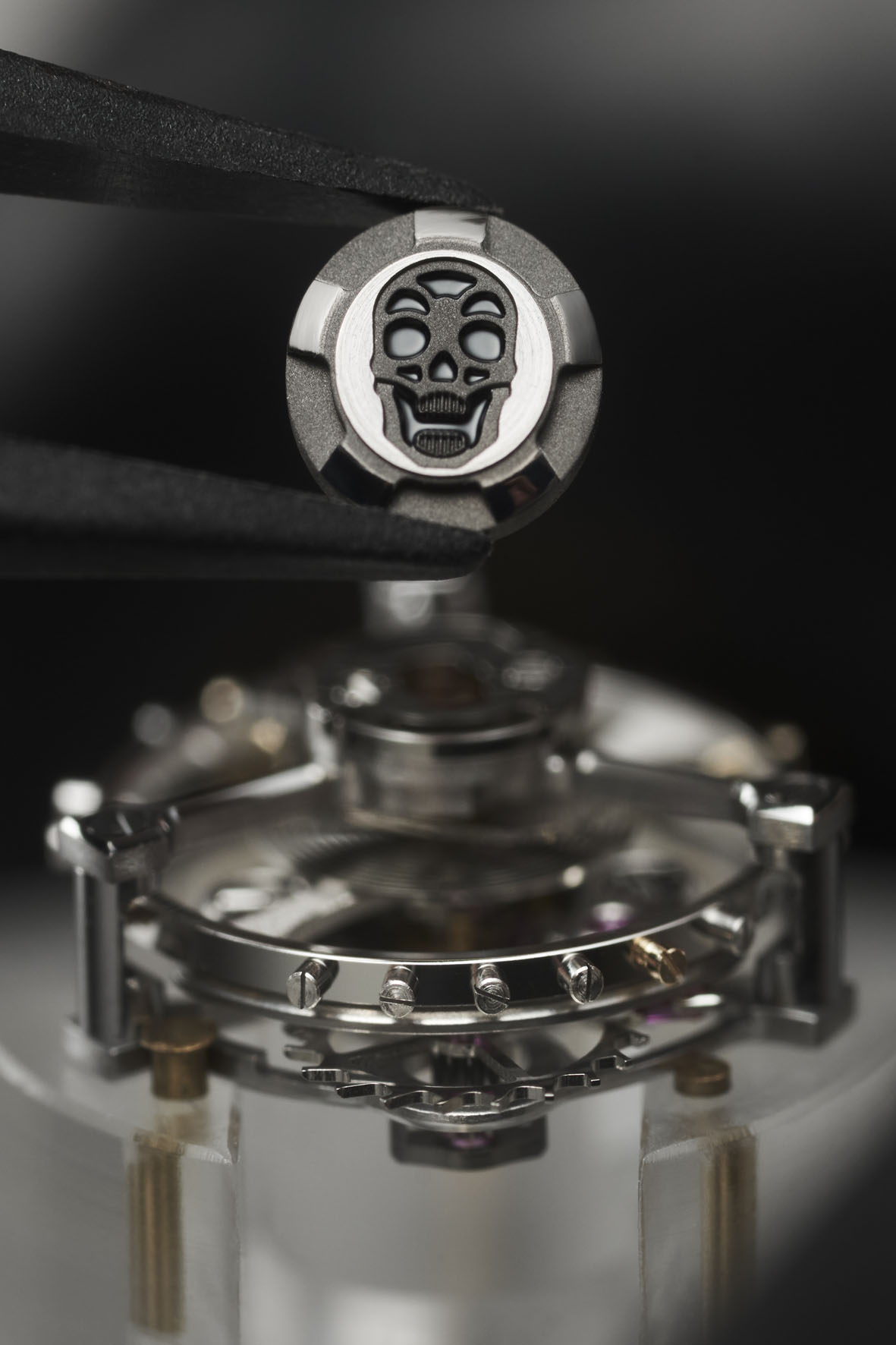 The extreme attention to detail is further revealed in the grade 5 titanium crown in the shape of a spider whose gothic-inspired segments embrace a ruby and its circular black rubber gasket. The engraved skullcap offers an additional nod to the RM 052 Tourbillon Skull. The torque-limiting crown means it automatically disengages when the tension of the barrel is optimal, eliminating any risk of over-winding.
