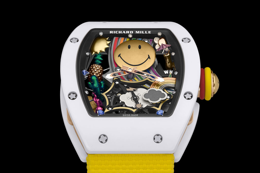 30 September 2022The new Richard Mille RM 88 Automatic Torubillon Smiley is highly technical and creative and took three years to develop. Each of its decorative elements are cheerful emanations of the Smiley world: a blossoming flower, the warm rays of the sun, a pineapple, a blooming cactus, a pink flamingo and a brightly-coloured rainbow. A festive cocktail to be savoured drop by drop, as the drinking glass in this neon pop scene suggests.