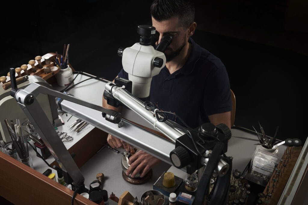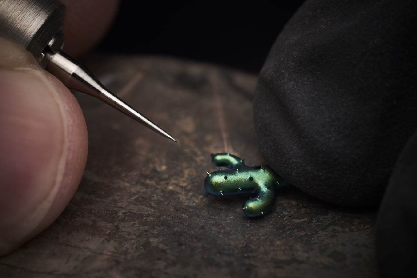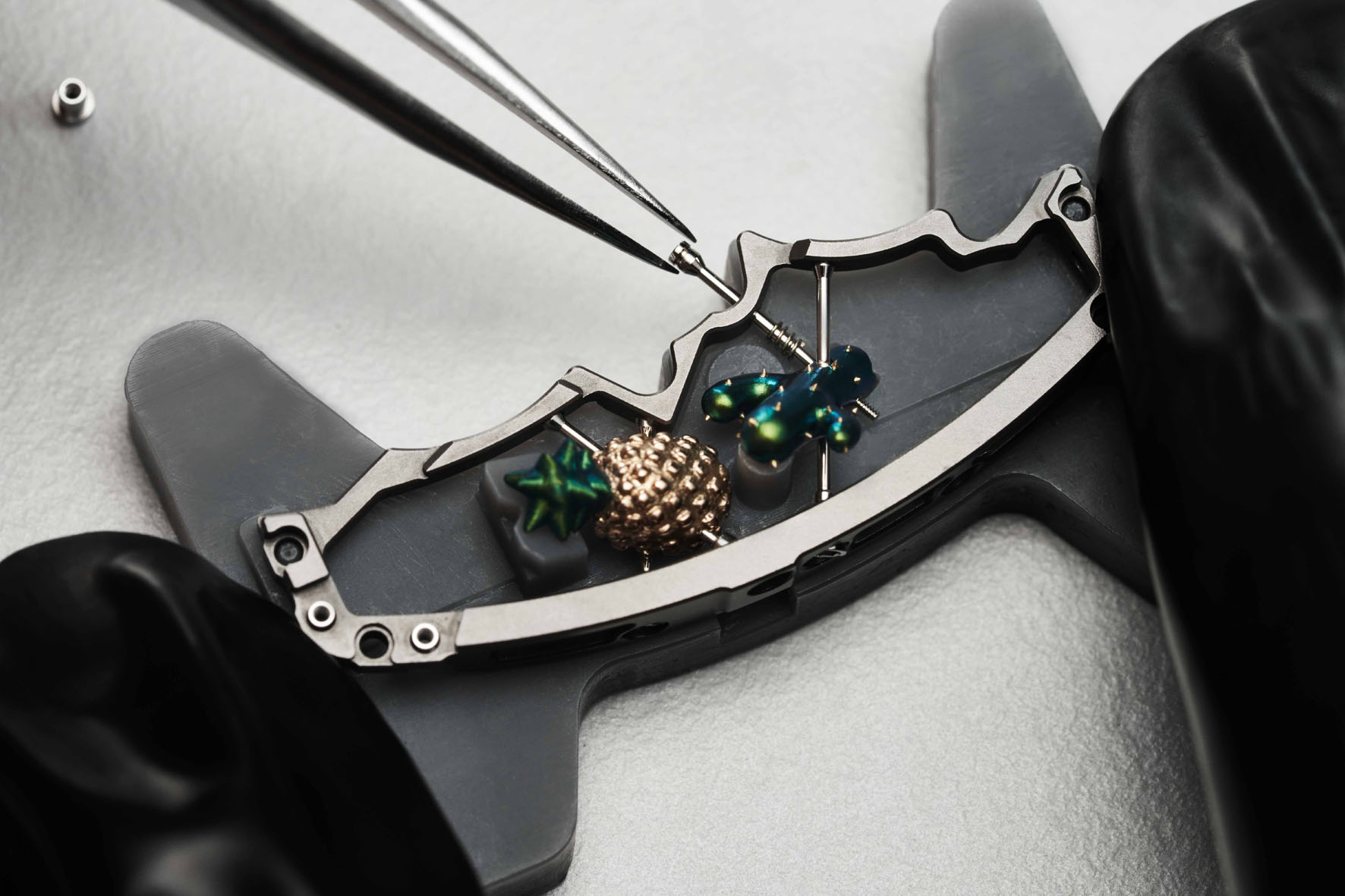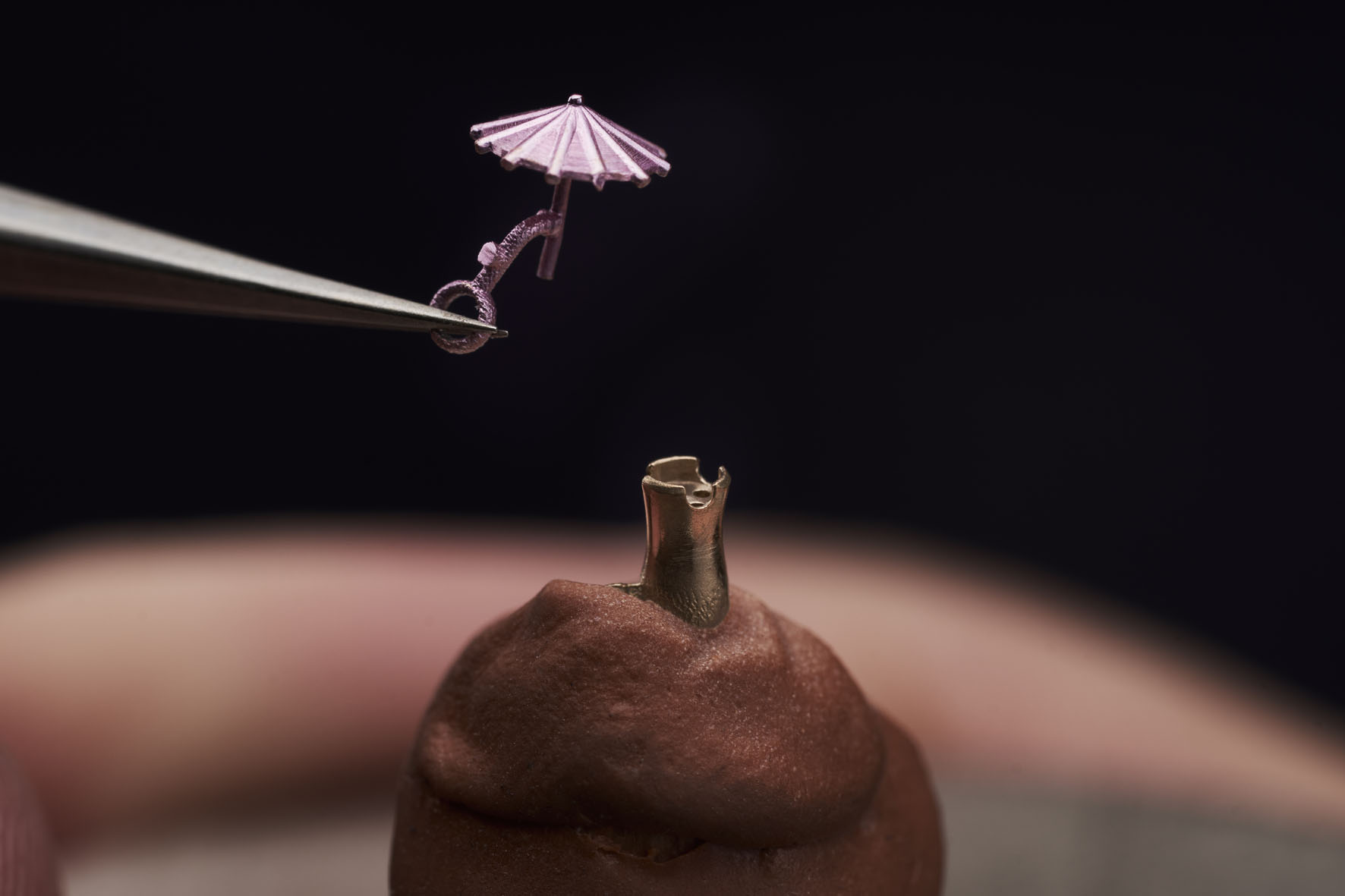 No effort has been spared in the finishing, down to the tiniest detail of each element in this display. The cocktail glass is an assembly of four parts, all in gold. The umbrella, the olive (1.7 mm in height), the 0.4 mm-diameter grooved straw – all polished – and the glass itself, its base micro-blasted to create the chilled glass, weigh a total of just 0.4 g. The gold flower above is mirror-polished, its petals brushed and rhodium-plated. The pink flamingo, 0.2 g of red gold, also undergoes multiple processes: its wings are polished and its feathers traced with the tip of a Dégussit grinding stone; its eye is made using the smallest beading tool in existence; its pedestal is micro-blasted and the part that depicts the grass and water is polished. The component is given a metallic pink PVD coating before the beak is painted black using a brush.
