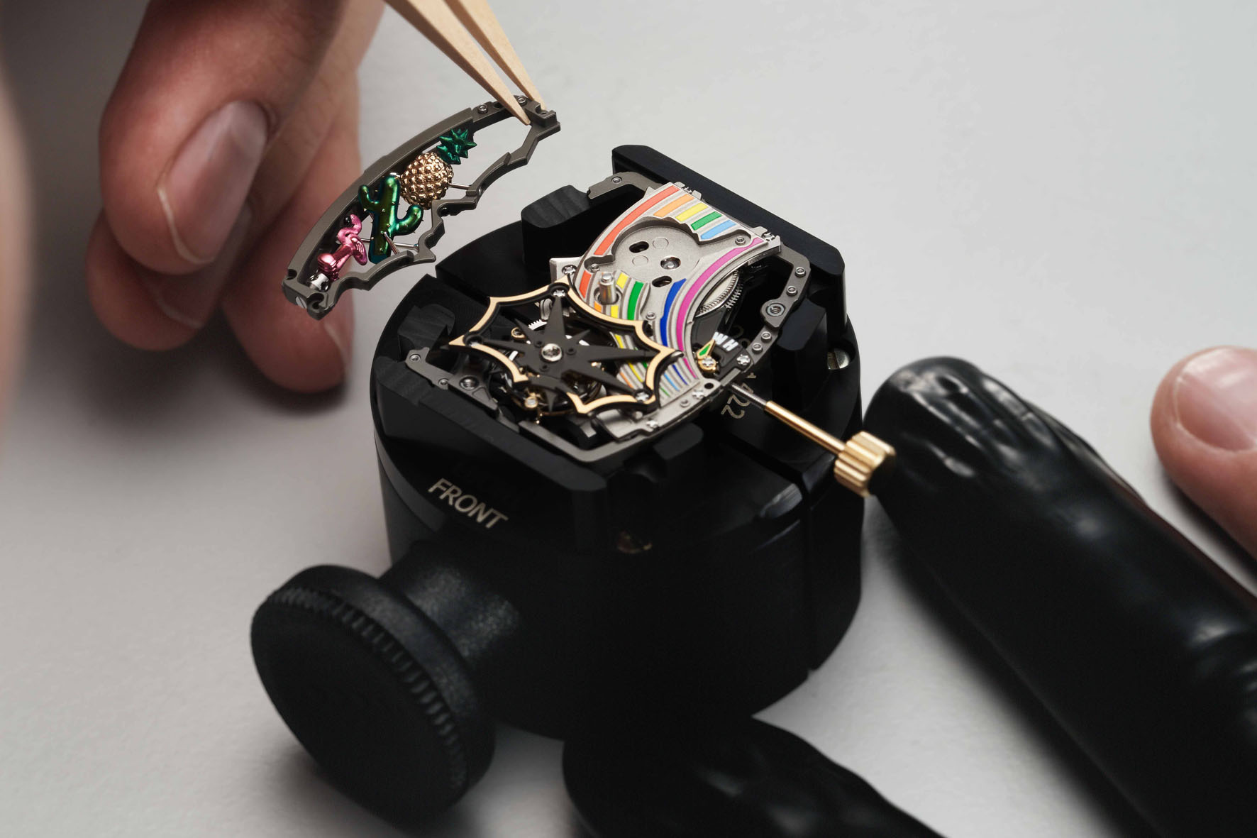 The RM 88 Smiley bears witness to a succession of technical and aesthetic challenges that were successfully overcome. The dimensions and weight of the gold micro-sculptures created by the engraver Olivier Kuhnrequired particular care, as the assembled parts, each weighing less than a gram, must withstand every type of shock. It was then necessary to determine how to arrange the objects in the three-dimensional space around the central motif, the Smiley, not only to maximise their effect but also to facilitate their insertion by the watchmaker. The solution was to equip the RM 88 with two baseplates: one technical, to support the movement, and the other auxiliary, to secure the ornamentation on the left-hand side of the dial. This second baseplate was subsequently mounted onto the movement and serves to present the objects on an inclined plane for added volumetric effect.