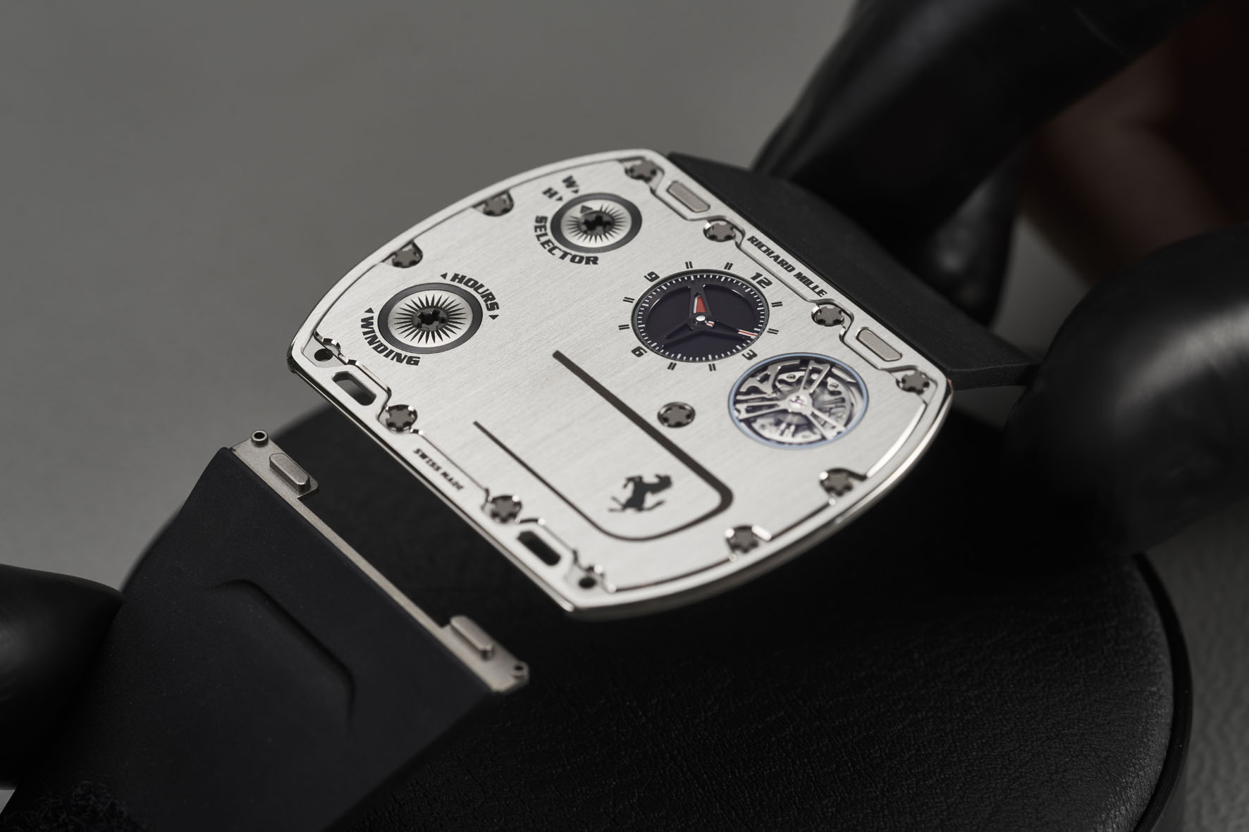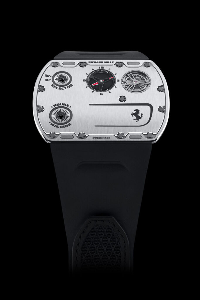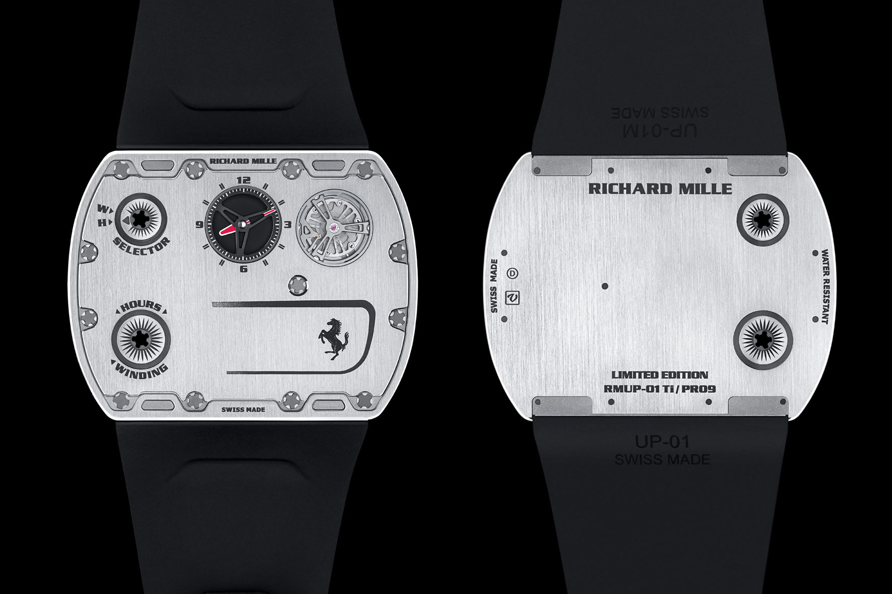 The collaboration between Richard Mille and the Ferrari teams, most visibly expressed in the choice of materials and execution of the watch, also precisely lent the project the competitive spirit so essential in the most exhilarating adventures. The RM UP-01 Ferrari is an allusive piece to Ferrari’s values, developing sporting mechanisms that are as elegant as they are immediately recognisable. Their models make no concessions and frequently contradict current trends to create new aesthetical codes. The RM UP-01 Ferrari bears witness to this partnership of the best know-how these two iconic brands have to offer in the combination of their ideas, understanding, respective developments and shared values.