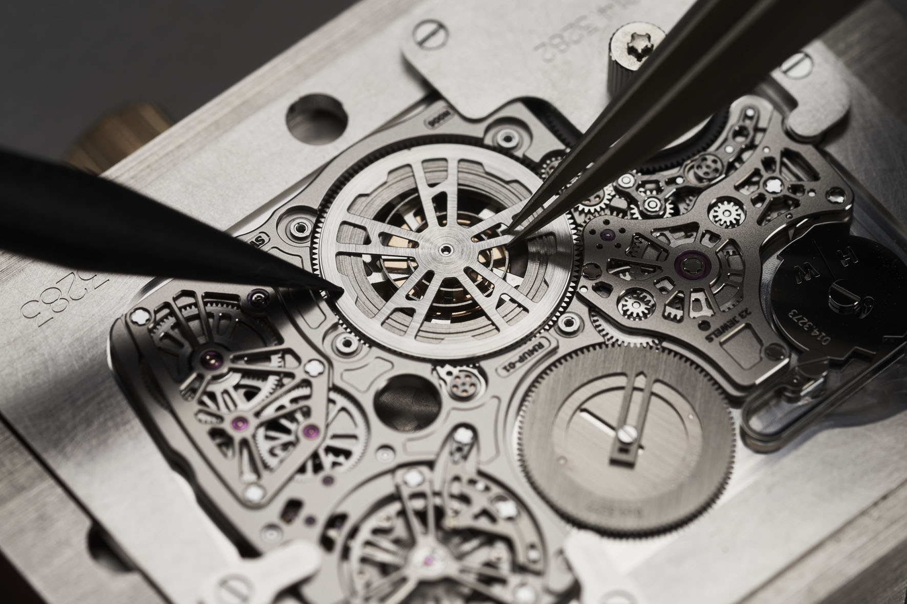Meeting the challenge of an ultra-flat watch precluded a traditional movement with superimposed gears and hands. Richard Mille therefore opted to distribute what could not be stacked over a broader surface area by creating a perfect symbiosis between the movement and case, each ensuring the necessary rigidity of the other.