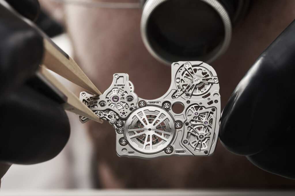 The RMUP-01 manual-winding movement with hours, minutes and function selector – capable of withstanding accelerations of more than 5,000 g’s – thus boasts a thickness of 1.18 millimetres, a weight of 2.82 grams, and a power reserve of 45 hours.