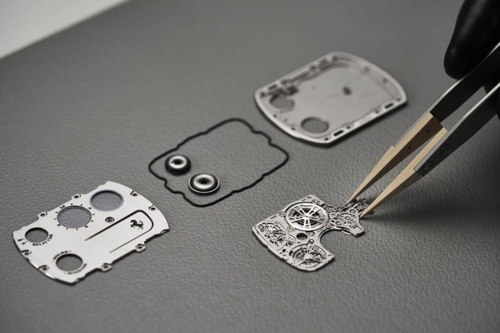 As a material for the case – just 1.75 mm in thickness and water resistant to 10 metres – titanium was chosen for the advantages it offers in combining lightness and laboratory tested resistance. The two sapphire crystals, one over the time indicators whose hands are directly affixed to the wheels, the other positioned over the regulator (balance wheel-spring assembly) to showcase the movement’s operation, were also reduced in thickness to two tenths of a millimetre with a diameter calculated to ensure their resistance during testing phases. The narrow tolerance range and extreme slenderness of each part required the focus to be particularly meticulous and checked at almost every stage of machining. It was therefore natural that the decision to produce and machine the case in-house in our movement department was the logical step to take for the RM UP-01 Ferrari.