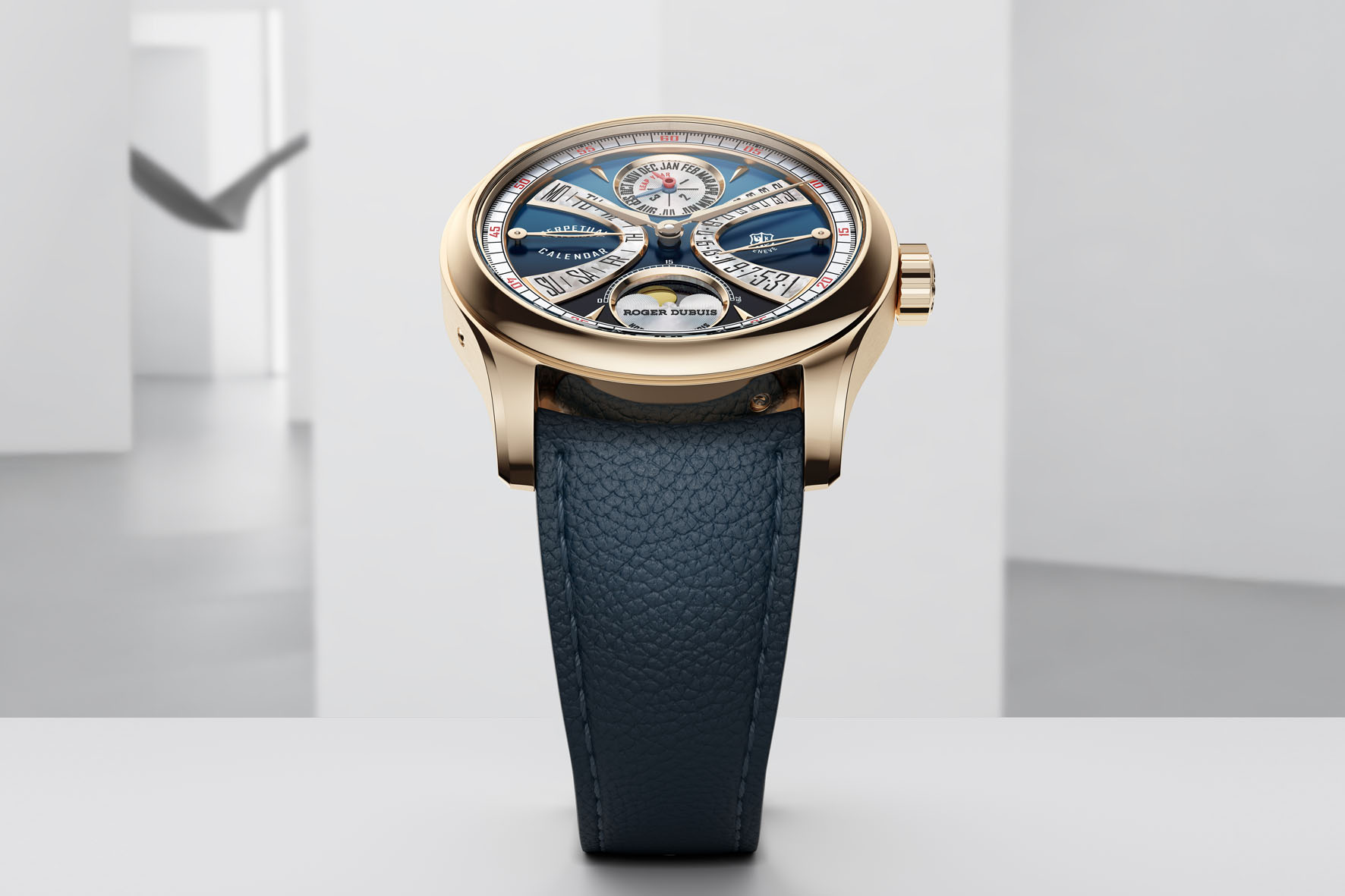 The main plate is produced in a colour known as “Leman Blue”, a tribute to Lake Geneva, which Mr. Roger Dubuis viewed each day as a watchmaking student on the train journey between Geneva and Vevey. It is lacquered to obtain a deeper hue and features applied hour markers, with transferred text and lunar month information.
