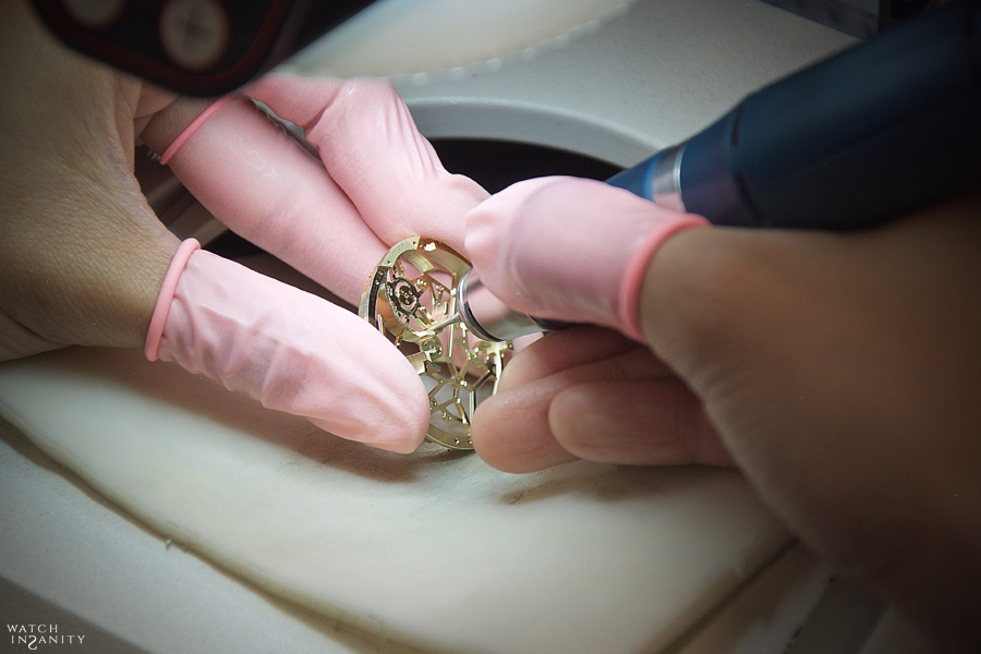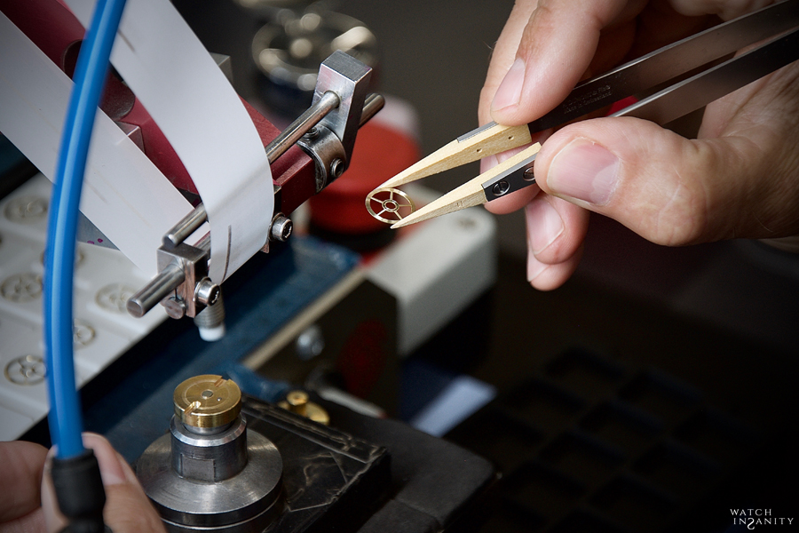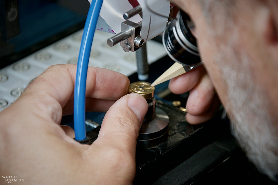 In our tour we are witness to a movement’s birth: in the first phases of the process, the technicians work with the metal bars that will become the platins, wheels, and pinions. The next steps are the finishing and decorations of the different components (detourage, perlage, cerclage, anglage, polissage), done according to the traditional high watchmaking techniques.