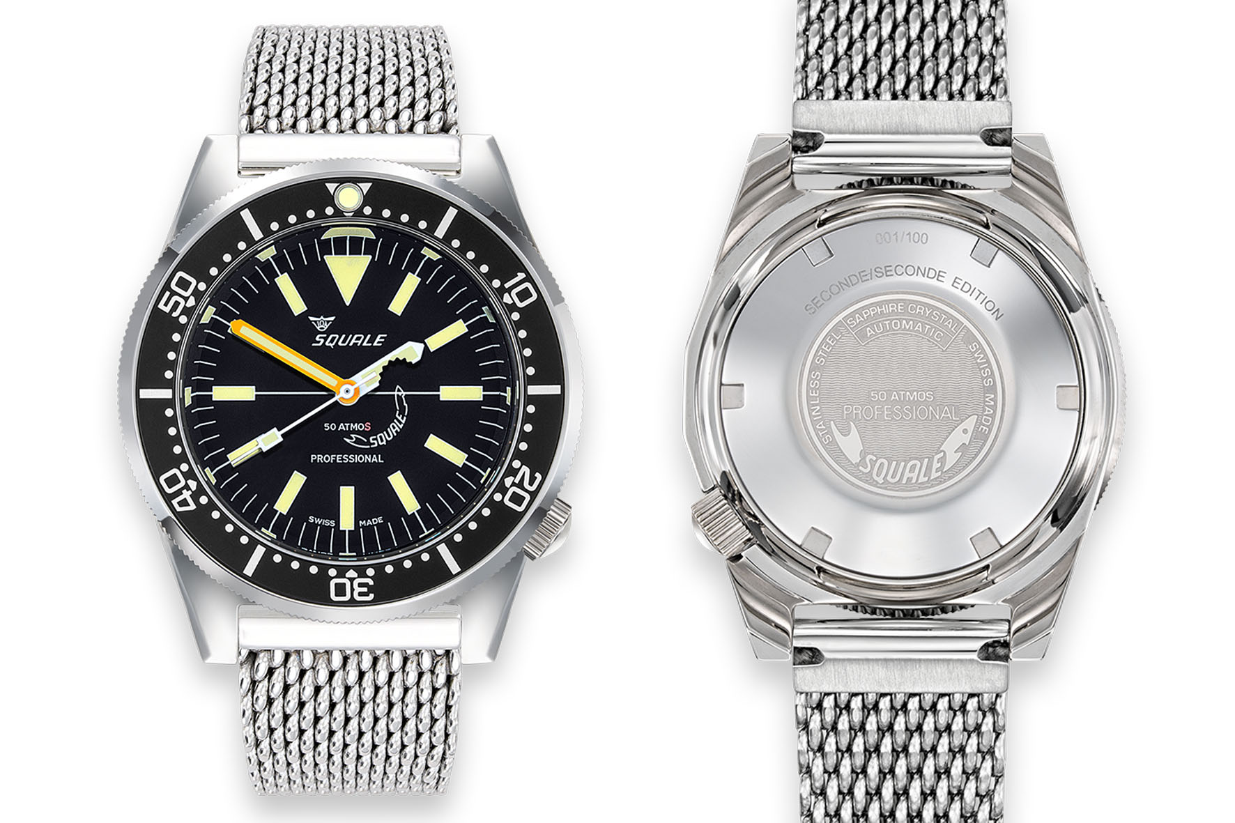 The automatic movement in its entirety is the robust Sellita SW 200-1 Elaboré, and the box includes: the Squale stainless steel “mesh” bracelet with polished finish and the exclusive Seconde/Seconde/ packaging also “wounded” by the Squale bite. The price is 1,1283 €, and will only be available via Squale’s official E-Boutique.