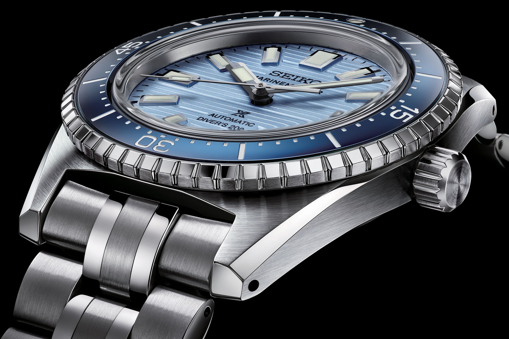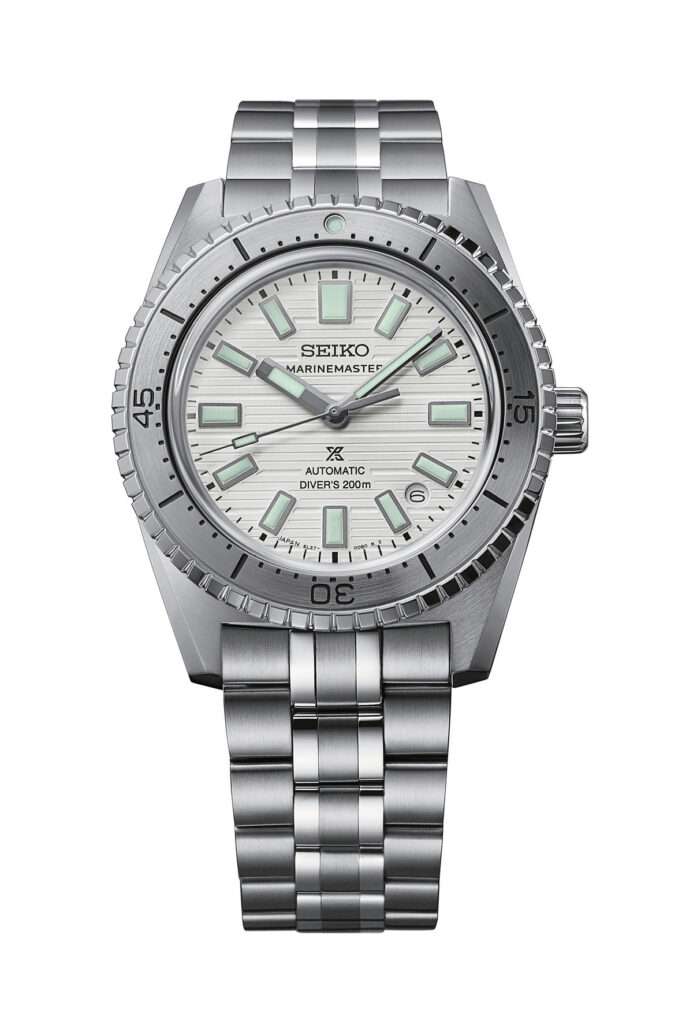 A textured horizontal stripe pattern expresses lapping waves on each watch’s dial while adding a stylish touch to the new design, which features “Marinemaster” printed just below the Seiko logo at the 12 o’clock position. A silvery-white dial graces a limited-edition version commemorating the 100th anniversary of the Seiko brand, while light blue and black dials join the Prospex collection as standard watches.
