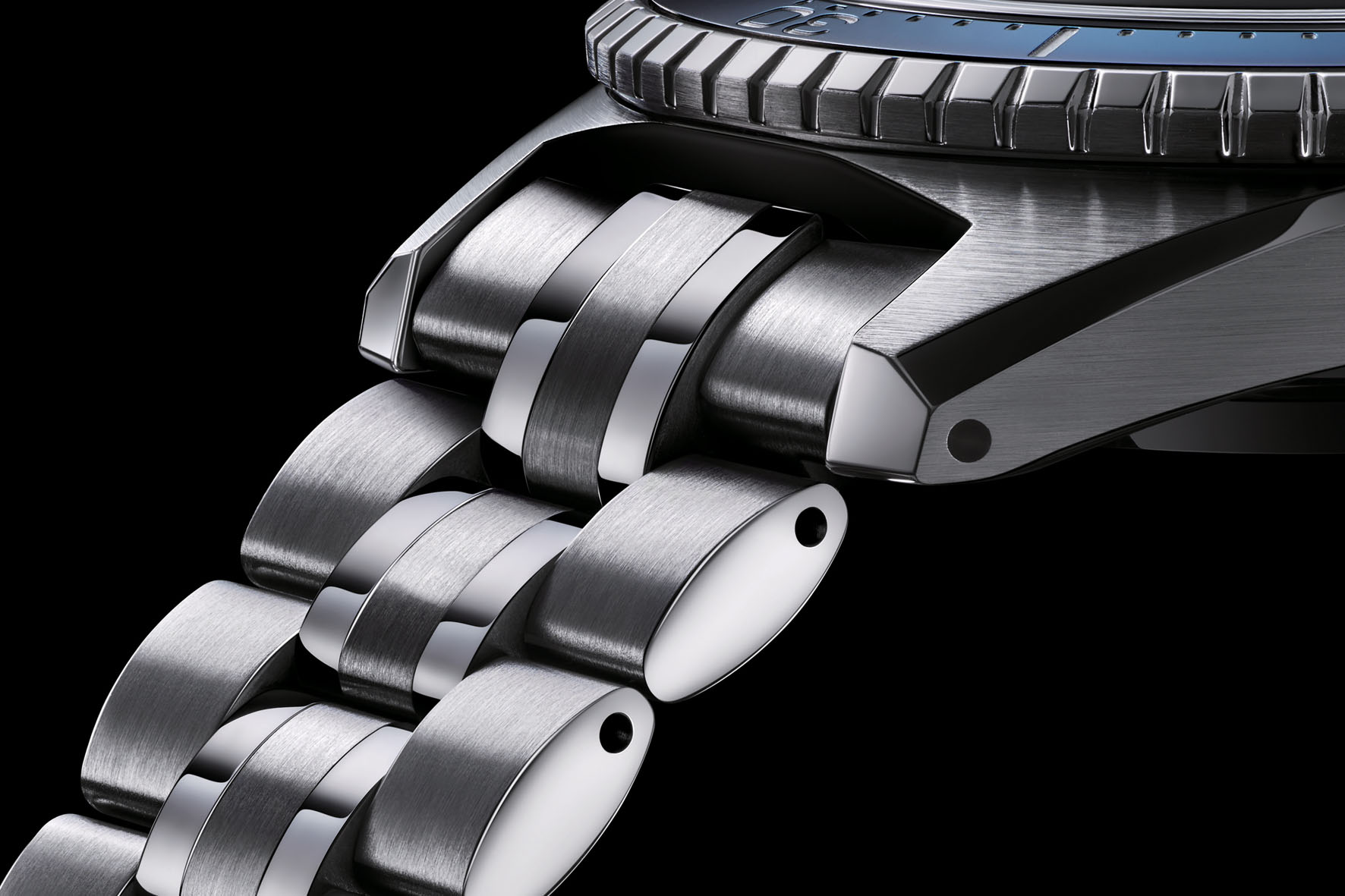 The new 39.5mm case design balances functionality and aesthetics thanks to dramatic cham- fering on the bezel and the case, which creates a sleeker and more modernized appearance while retaining the essential profile of the classic 62MAS from 1965. The combination of the hairline and mirror finishes on the case and bracelet endows the design with a sophisticated contrast and elegance.