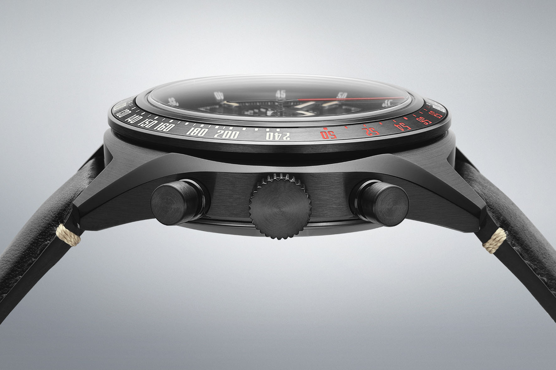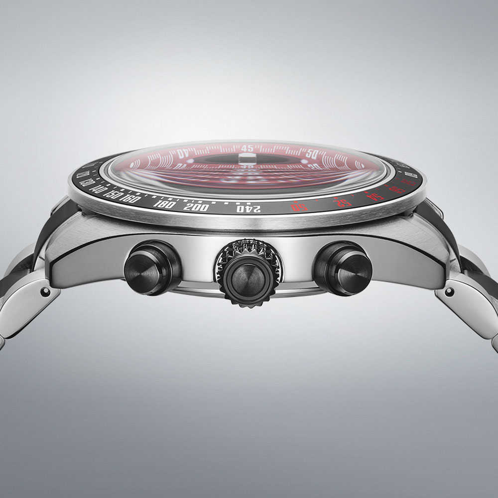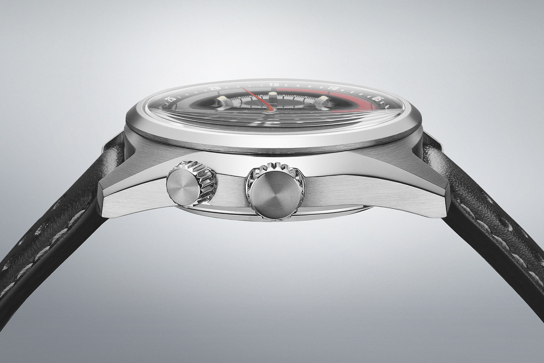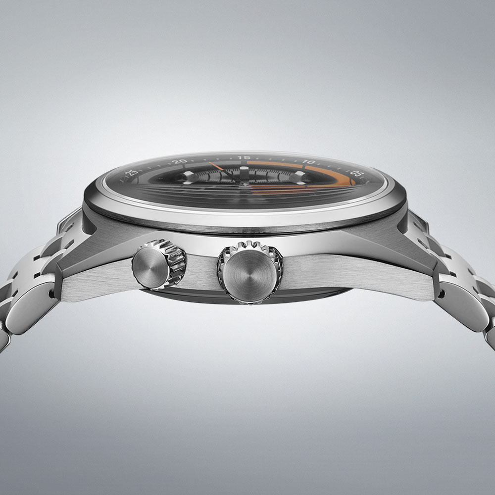The first two immediately catch the eye with their combination of compact size and vintage aesthetics. The case has a diameter of 39.5 mm and a thickness of 12 mm — a combination which, together with the exceptionally soft steel bracelet, makes them extremely comfortable to wear. The characteristic lines of the Speedtimer introduced in 1972 are also evoked by the dials, silver-white or black with applied hour markers, and by a special feature: a rotating flange (adjustable via a crown at 4 o’clock) that allows the wearer to set a countdown to measure time intervals, readable via an orange band on the dial between 9 and 12 o’clock.