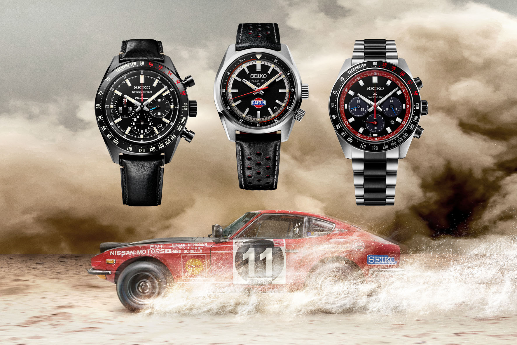 Seiko joined forces with Datsun in motorsport in the early 1970s, and in 1971 the Datsun 240Z number 11, decorated with the Seiko logo, tackled the extreme conditions of the East African Safari Rally — between Kenya, Uganda, and Tanzania — covering 6,200 kilometres to claim victory. This race is still considered one of the toughest in the world today. In tribute to that partnership and victory, Seiko has created three limited-edition Prospex Speedtimers which, true to their history, found themselves — dare we say — more than at home in the Agafay Desert.
