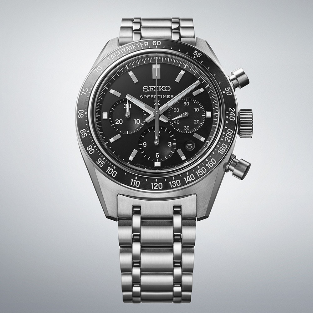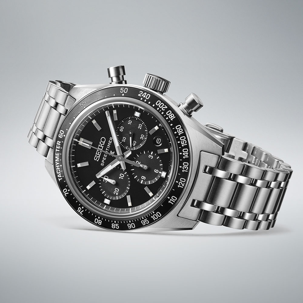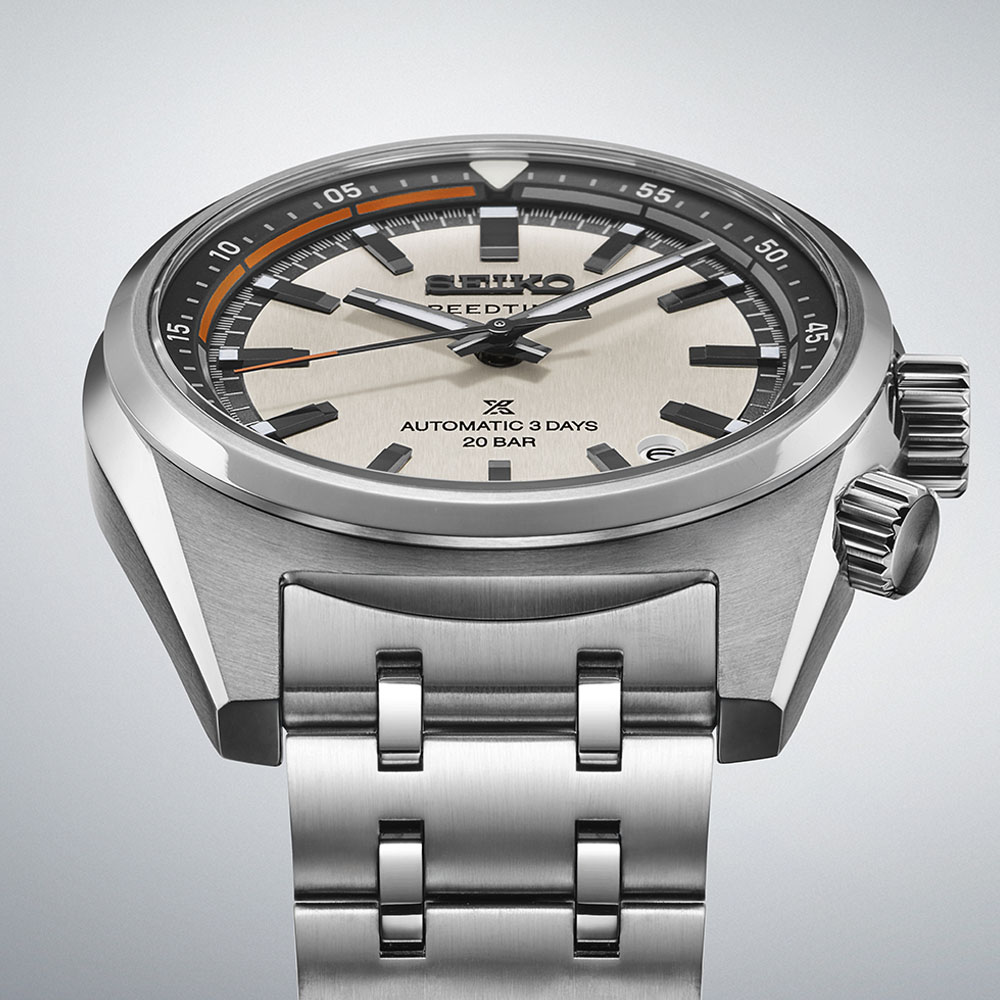 Both chronographs feature steel cases (black for the SRQ057J1), but in different sizes: 42 mm by 14.6 mm for the mechanical model and 41 mm by 13 mm for the solar version. Both, however, have a tachymeter scale on the bezel, which allows speed to be measured even in the range between 50 and 60 km/h — a detail borrowed from the first Speedtimer of 1969. The time-only model offers the same performance and functions as the Speedtimer SPB513JE and SPB515J1. What truly sets these three watches apart is the Datsun spirit that animates the line, reflected in various design details.