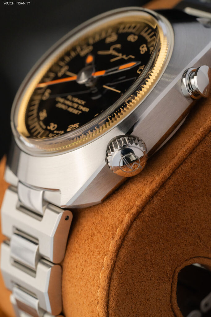 On the 1969 Timer, inevitably, the calibre is different but no less ingenious, as can be deduced from a functional and design detail: the presence of a push-piece at 2 o’clock, with the winding crown moved to 4 o’clock. After all, we are talking about a single time: what would be the point, then, of an additional push-piece? The secret lies in the AGH 6363 calibre, a re-engineered version of another Singer Reimagined calibre, the Flytrack.