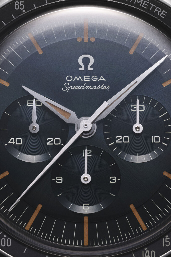 Beneath the brand new hesalite-like form sapphire crystal, OMEGA has included a CVD-coated dial in a grey-blue colour, replicating the tone of some CK 2998 watches produced in the 1960s. Along with hour markers and hour/minute Alpha hands that are filled with vintage Super-LumiNova, the central seconds “Baton” hand is white varnished to match the transferred markings.