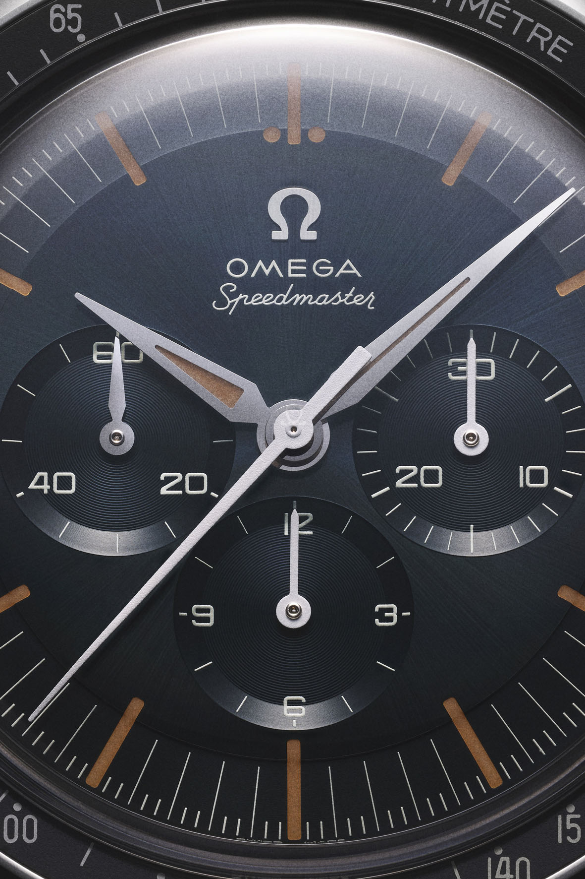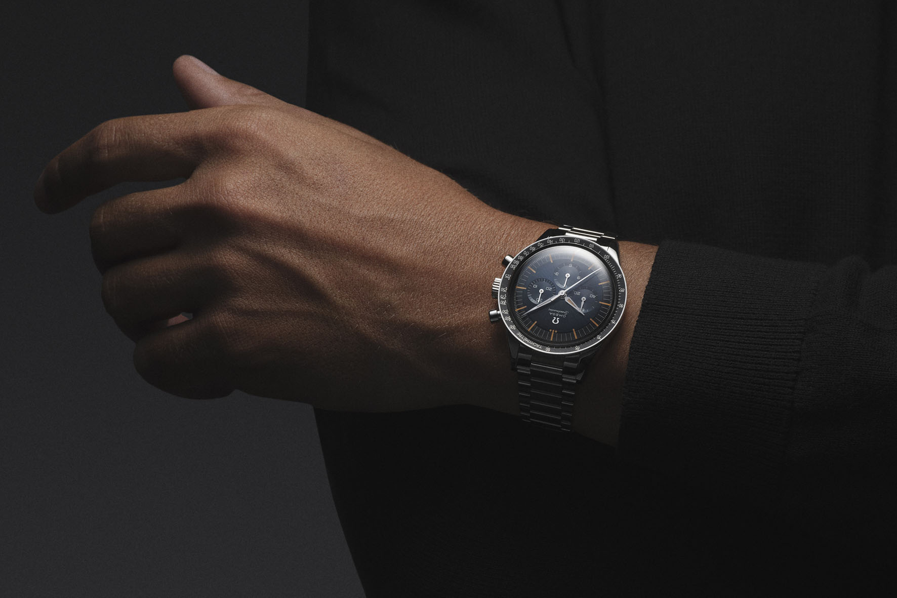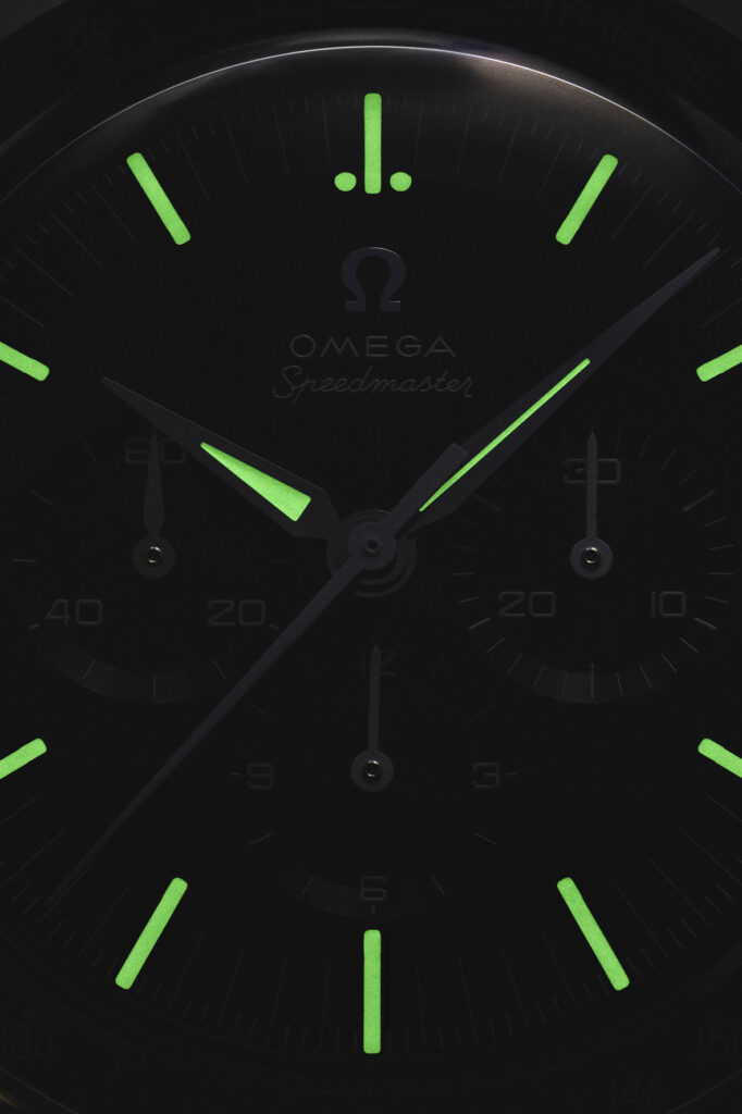The dark bezel ring has been produced in black aluminium, and features the Speedmaster’s essential tachymeter scale, including the “Dot Over Ninety” that is synonymous with the earliestSpeedmastermodels.