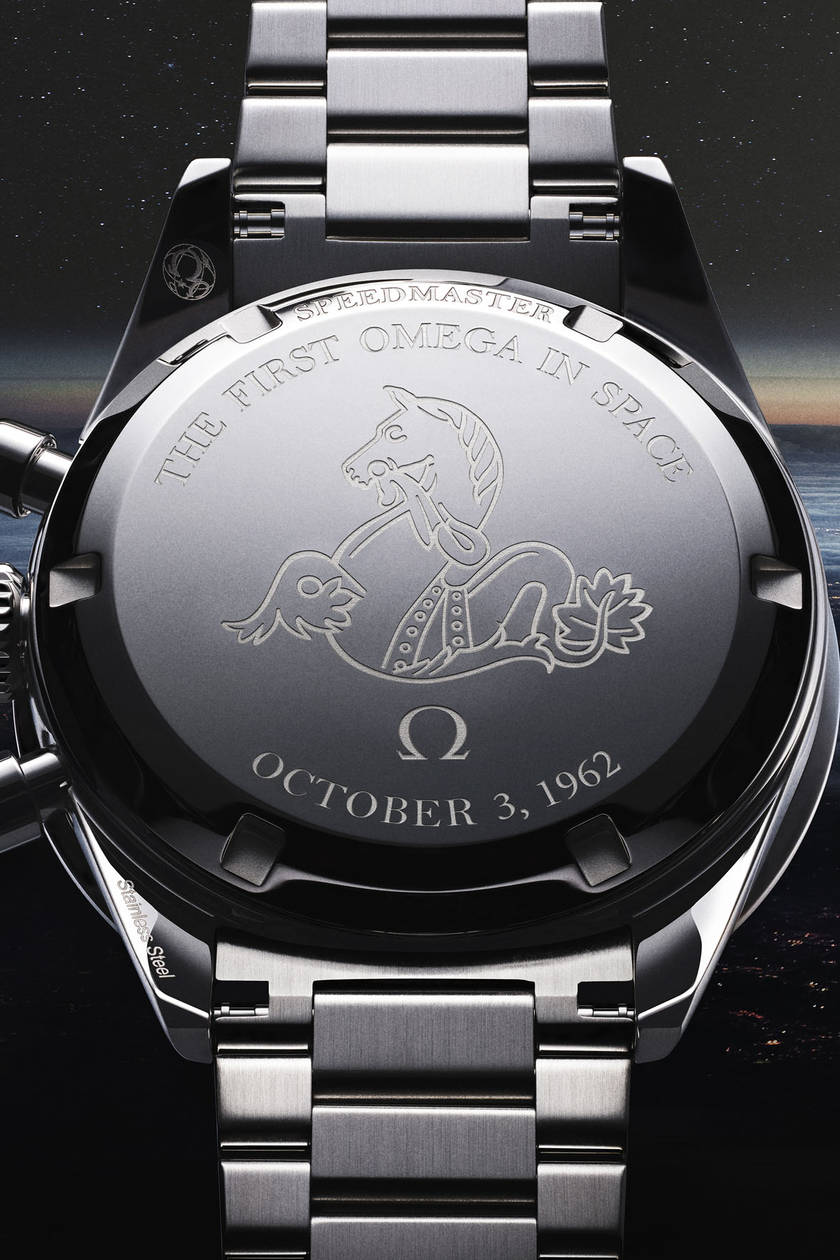 In keeping with OMEGA’s brand heritage, the watch features two vintage OMEGA logos, including one on the dial, and another on the crown. The historical celebration then continues on the caseback, where OMEGA has integrated a Seahorse medallion, and the engravings, “SPEEDMASTER”, “THE FIRST OMEGA IN SPACE” and “OCTOBER 3, 1962”.