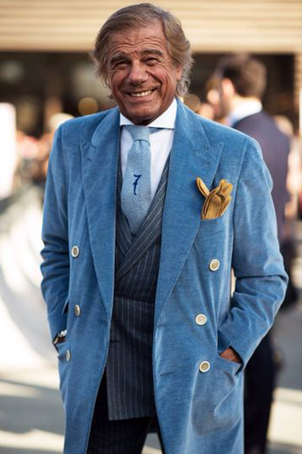 18 November 2016Lino Ielluzzi, well-known protagonist of the red carpet at Pitti Uomo and owner of the prestigious boutique “Al Bazar” in Milan, is considered to be an icon of style. His great ability, or rather it would be better to define it as ‘ innate dowry’ in combining fabrics, colours, accessories with personality and refinement have made her a symbol of gentleman par excellence in Italy and beyond.