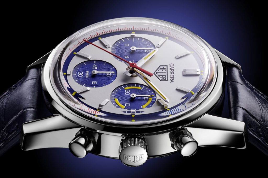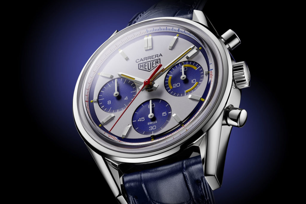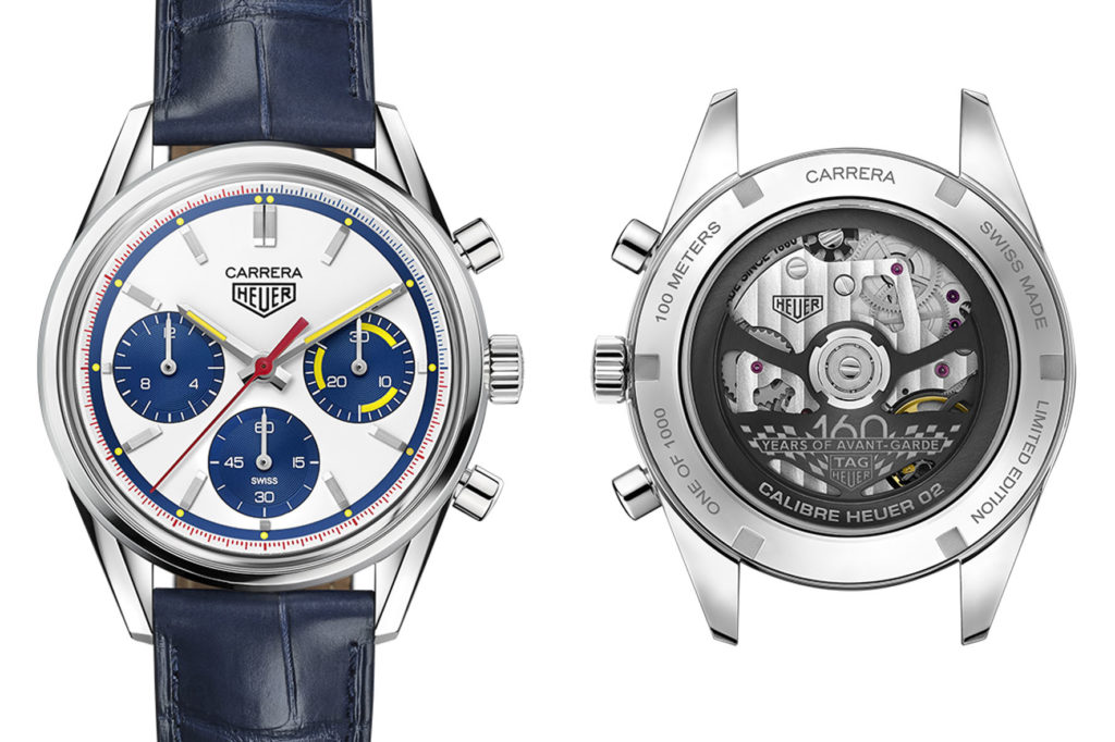 The dial is protected by a domed “glassbox” sapphire crystal. The 39mm polished stainless-steel case is paired with a blue alligator leather strap, reflecting the splash of colour on the dial. The unique limited-edition number of each piece is engraved on the case back, where the innovative Calibre Heuer 02 and its dedicated oscillating mass are visible through the sapphire crystal.