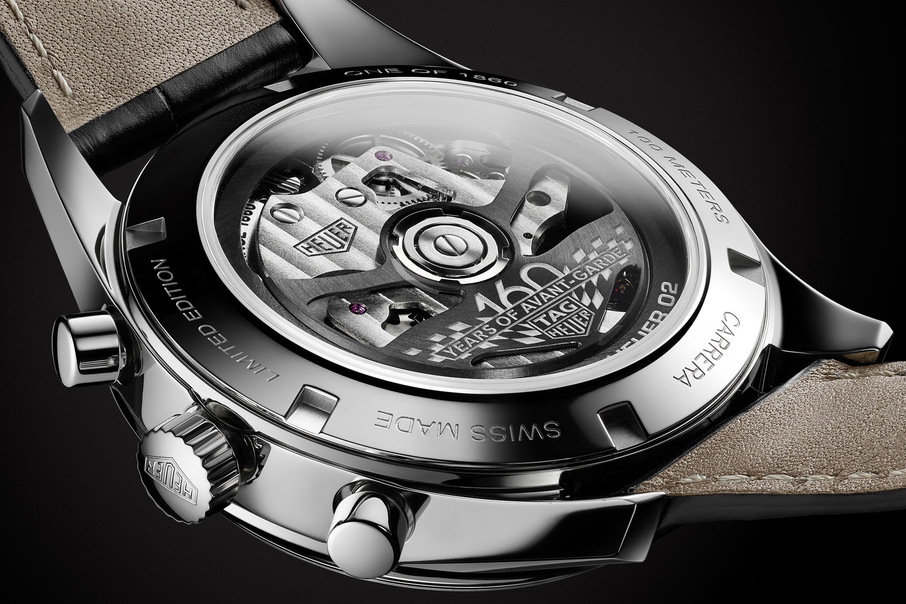 Presented on a black alligator strap, this model is limited to 1860 pieces – a nod to the year that Heuer was founded – and “One of 1860” and “Limited Edition” are engraved on the case-back. The redesigned oscillating weight, visible through the screwed-down sapphire crystal, is adorned with a lacquer-filled engraving that distinguishes the timepiece as an anniversary edition.