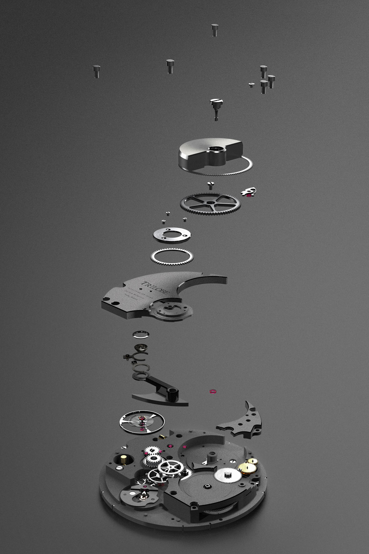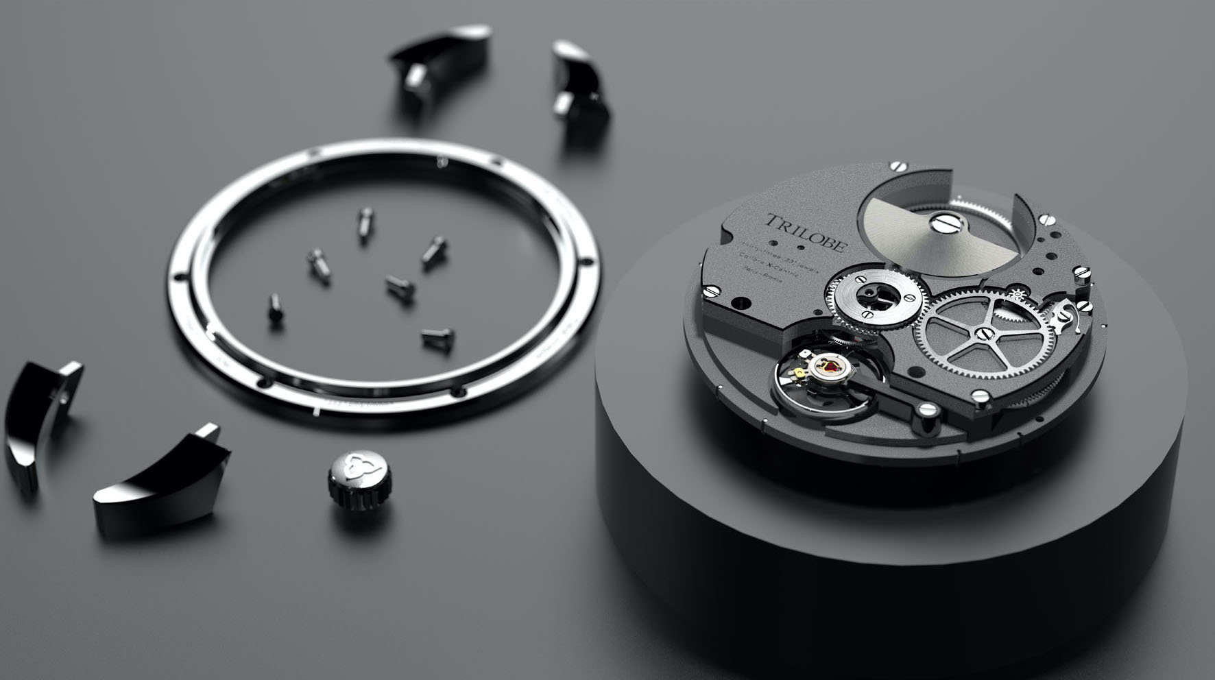 We wanted to equip our watches with a calibre in harmony with Trilobe’s spirit and architectural DNA. We chose to play with contrasts by designing this movement in a concentric way around symmetrical axes, at the opposite of our eccentric dials. We drew our inspiration from brutalism architecture, characterized by a striving to create functional buildings with a pure design, a clear exposure of the structure and a valorization of the materials for their intrinsic qualities. The electroplating bath treatment of the bridges and plates gives them a gray anthracite color reminiscent of concrete and offers a contrast between a search for brightness on the front side and an invitation into the storm gray depths on the reverse side. The micro-rotor was chosen to expose the structure of the movement by revealing its components, that are usually hidden away. It also allowed us to reduce the thickness of the watch for more elegant proportions. It is made from tungsten, a heavy material that produces enough power to put our energy-consuming time display in motion (3 rings are much heavier than 3 hands…).