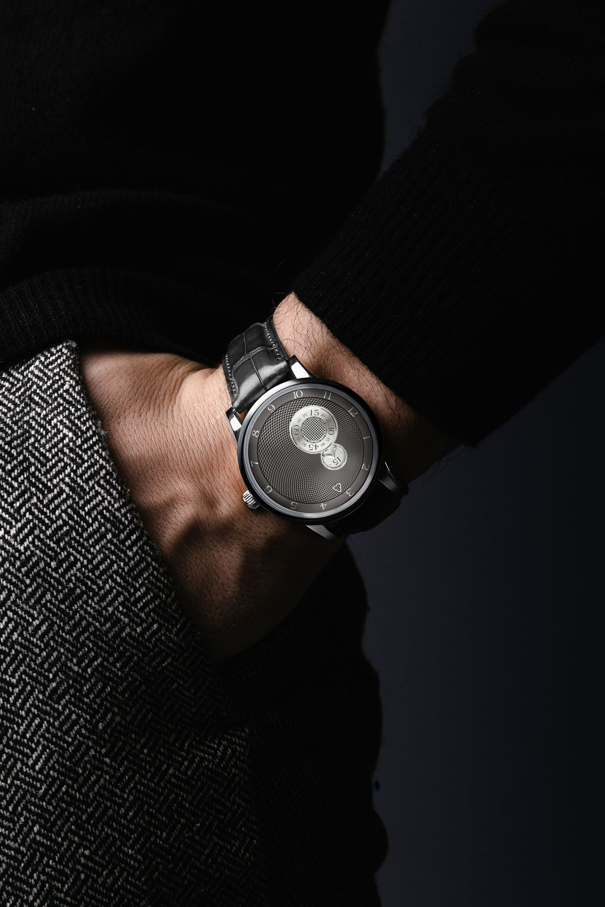 Regarding our collection Nuit Fantastique, the dial is made up of 4 parts, three of which are in permanent rotation: the larger ring for the hours, the minute wheel that appears within an aperture, and the seconds wheel. Two indicators allow to read time, one for hours and another for minutes and seconds. The dial is made of brass with a graining realized with a counterstrike and the colour is obtained by electroplating bath. The intertwining of the minutes and seconds gives a glimpse of the infinite and the time that goes on endlessly. At the centre of the seconds wheel, you can observe a clous de Paris guilloche encircled by a railroad track itself encircled by an azured ring worked with a comb. Look closely, the surface beneath the numerals is not plane but waved. The design of this collection is inspired by deconstructivism architecture, which shakes up the conventions, and disturbs our way of conceiving shapes and their functions.