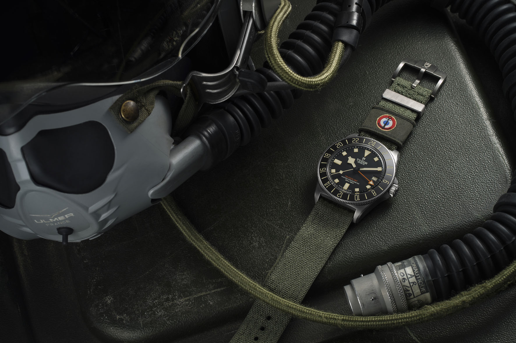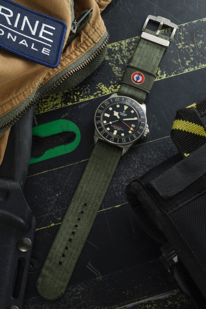 Historically, the French Navy had TUDOR watches delivered without bracelets and then fitted them with their own straps, handmade or otherwise. Two strap types appear to have been particularly used over the years: black straps made from a single piece of braided nylon, and, less commonly, handmade straps made from parachute elastic, which could be recognised by their green colour and yellow or red central thread. It is to these ultra-functional relics, inextricably linked to the French Navy, that the fabric strap of the Pelagos FXD GMT pays tribute. In the case of the Pelagos FXD GMT, the colour of the strap matches the specific colour of the flight suit worn by aviators of the French Naval Aviation.