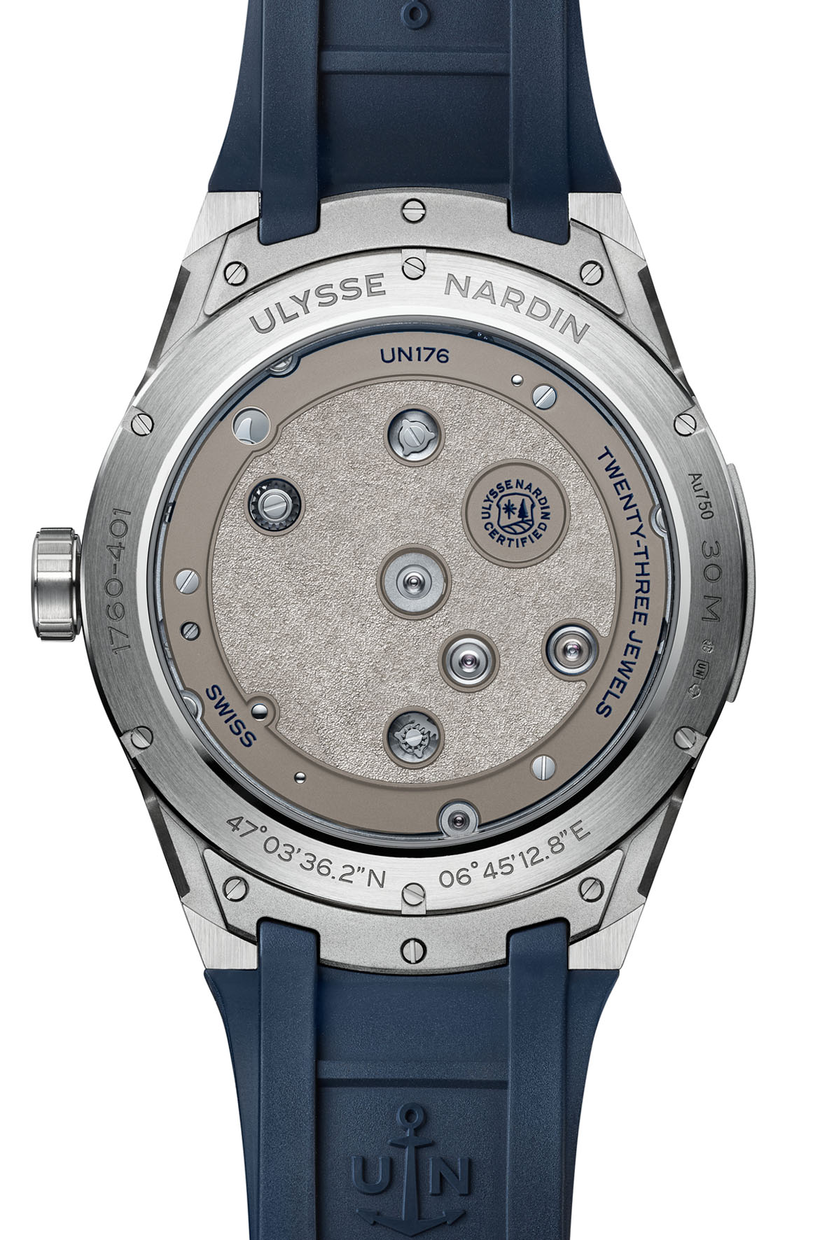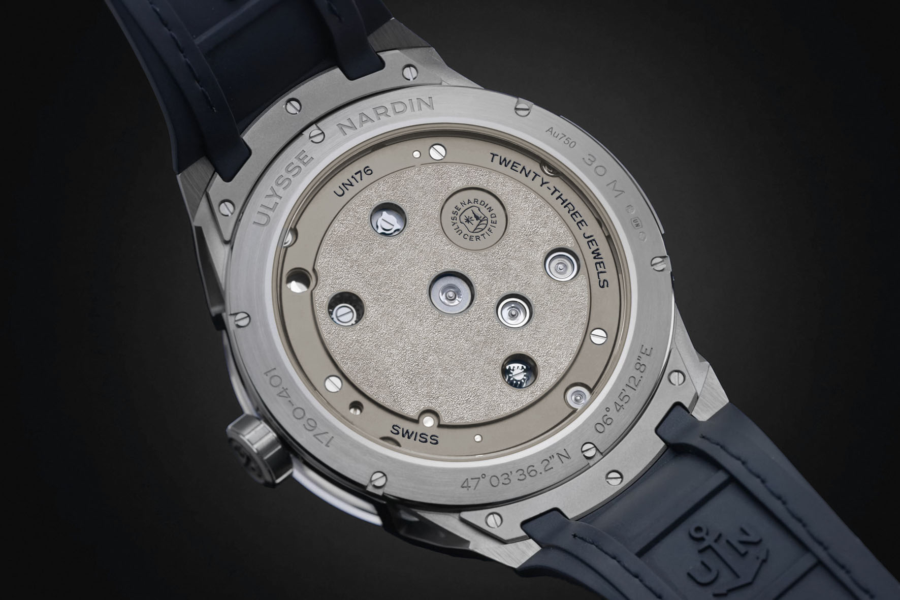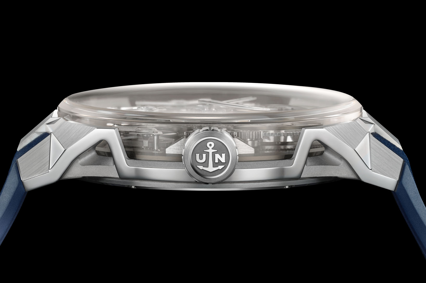 At the heart of this edgy Haute Horlogerie complication, the unique and innovative UN-176 calibre seems to defy not only the laws of physics, but also the very principles of watchmaking construction. Perfecting this flying movement, entirely designed by the integrated Manufacture, required two years of research and development to Ulysse Nardin’s technical department.