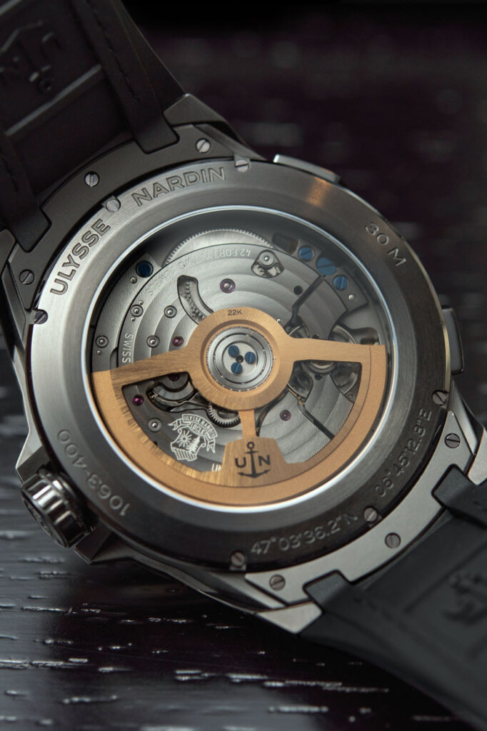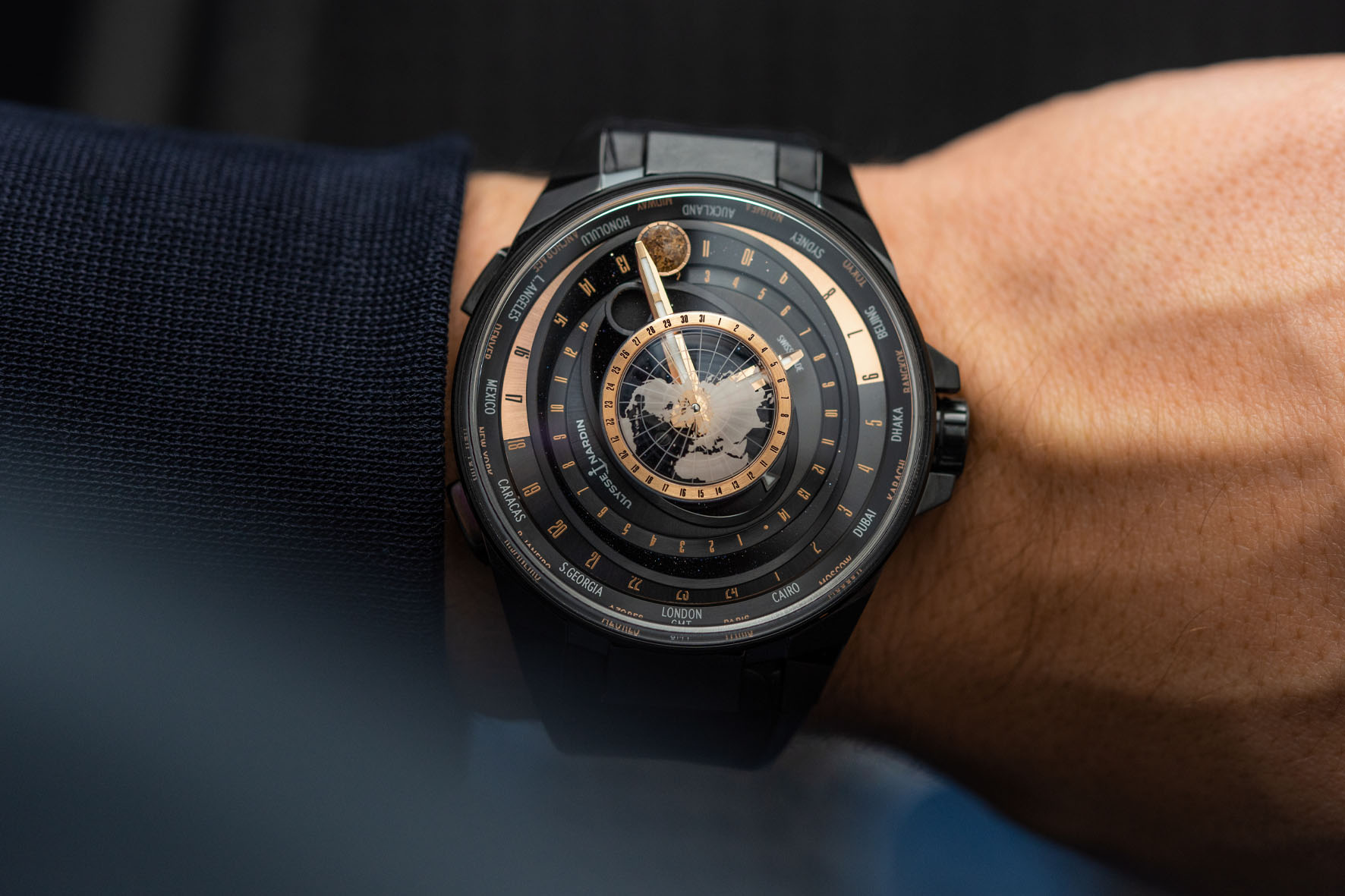 Complex in appearance, it is easy to read and also easy to adjust, as all the information can be set from the winding crown. A little concentration when correctly positioning all the useful information, from the reference city to the local time and date, suffices to ensure that the complication built into the automatic Manufacture caliber UN-106 subsequently manages all the displays on its own as long as the watch is worn. And when it isn’t, it just needs to be put back in the box supplied, which contains an automatic winder designed to take care of the winding and keep its calendar information accurate.