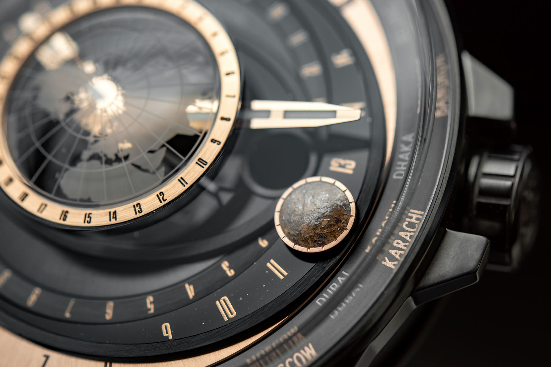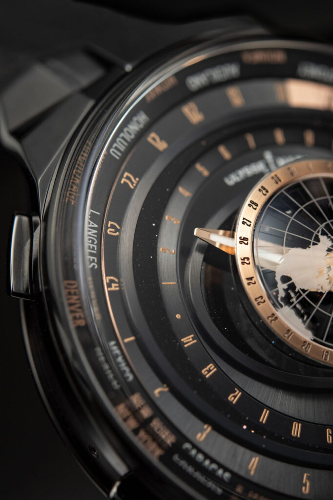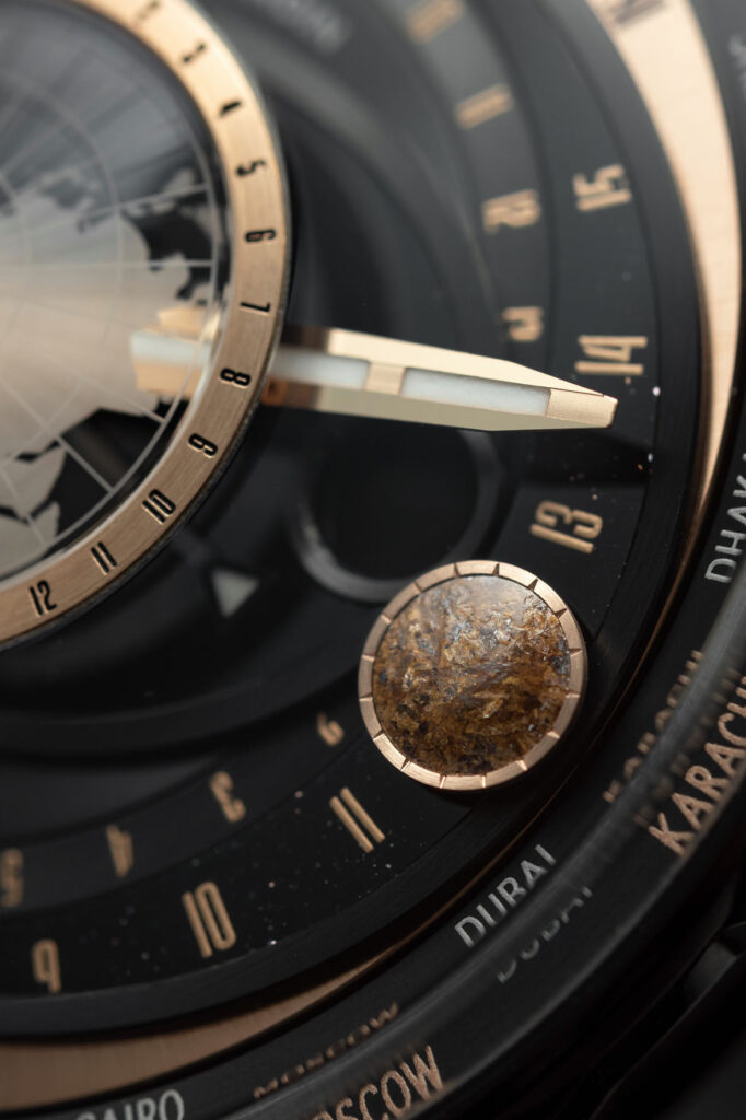 To accentuate this sensation of being at the heart of the universe based on observation of the watch, the designers chose to place the part of the northern hemisphere seen from the North Pole at the center of the instrument’s sapphire crystal. To increase the impact of the 3D effect, the domed crystal, with the land masses micro-engraved on the inside, is set in the protective sapphire crystal box encircled by an 18 ct rose gold ring engraved with the 31 days of the month, which has for a pointer a small triangle loaded with luminescent material.