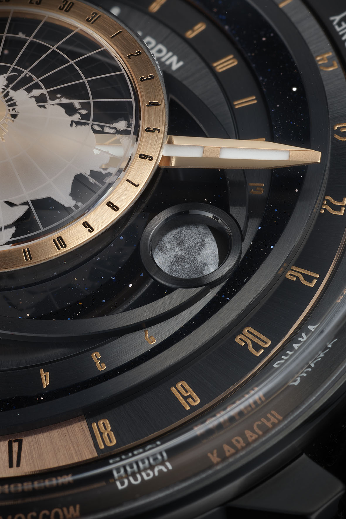 In addition to the time display observable against a background of the night-sky portrayed by a disk made of aventurine, times around the world can be read with the aid of the fixed flange bearing the names of cities and the rotating disk on which a sun in relief and the time indications appear at 12 o’clock. The watch also has a Dual Time mechanism. This allows changing of the main display in leaps of full hours with the aid of the two pushers located on the left side of the case middle to show the time in a given country on the dial while keeping the initial time alongside the reference city. This highly efficient watch also possesses an aperture that, showing the phases of the moon in a realistic manner, associates its course with a three-dimensional representation of the sun located at 12 o’clock on the time display for the reference time zone.