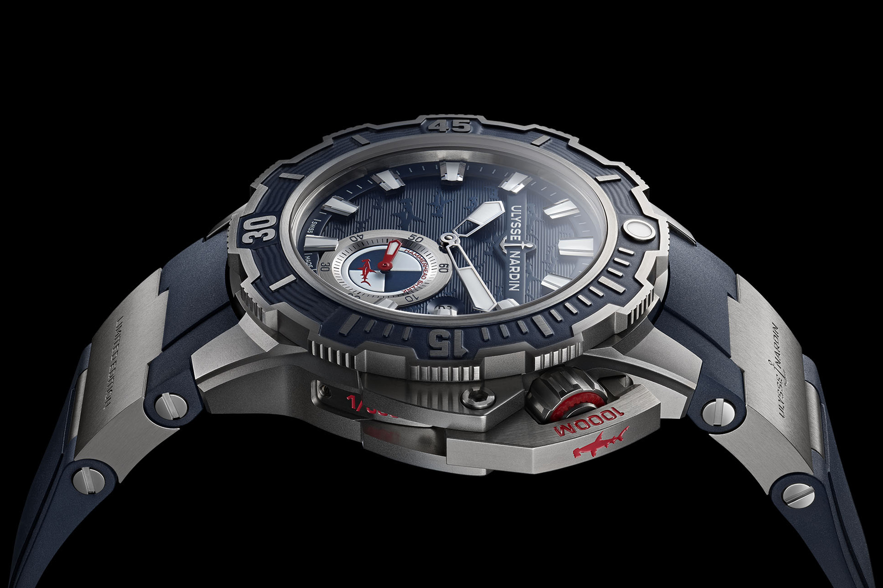 15 hammerhead sharks adorn the dial; another is stamped on the caseback; a bright red one swims on the side of the crown guard; and another decorates the dial counter. Destined for fans of diver watches, the new Ulysse Nardin Diver Deep Dive is a limited edition of only 300 pieces and is available at CHF. 12.000