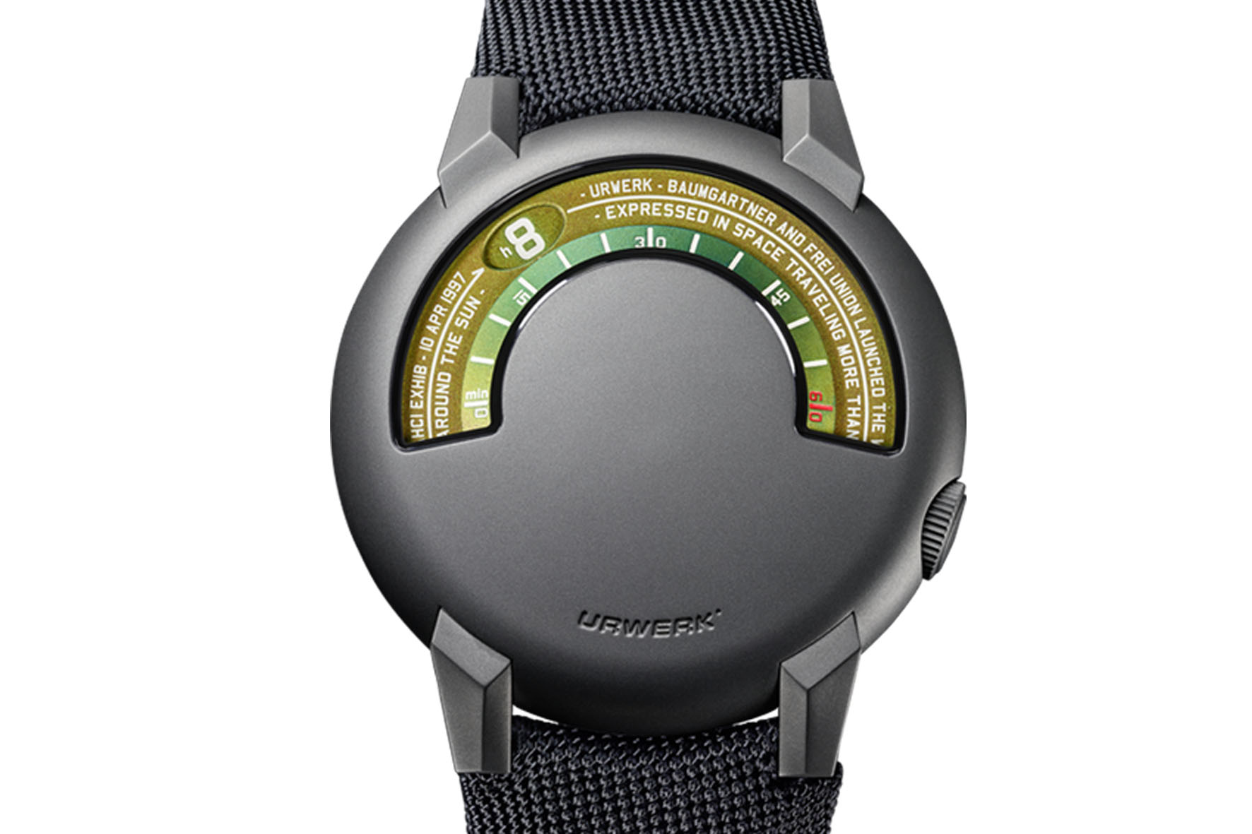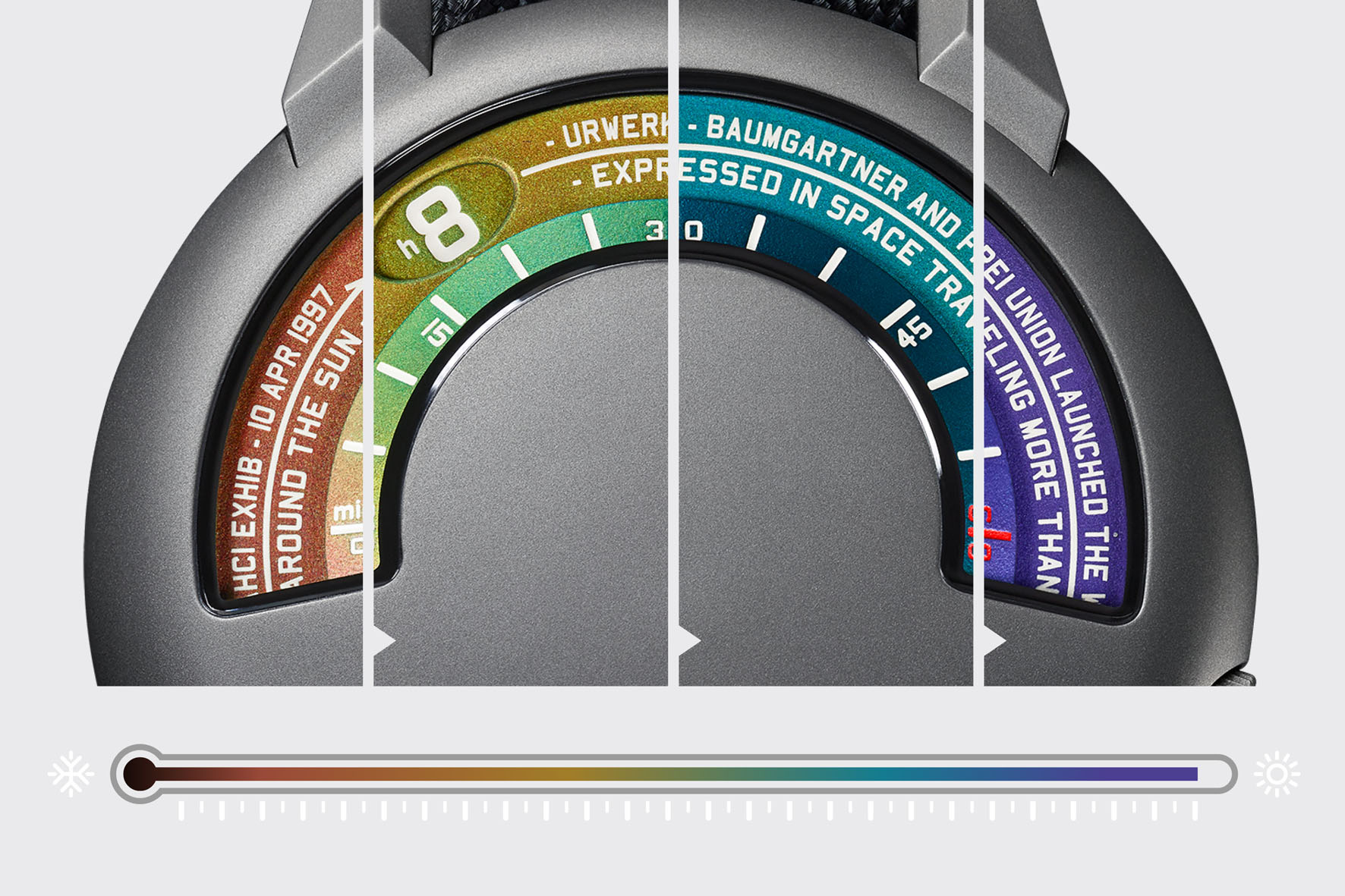 In this instance, Jacoby revisits the notion of graduation. This first UR-102 “reloaded” displays a wandering hour that counts down time in both analog and digital formats. On the dial of this one-of-a-kind watch, Jacoby uses thermochromic pigments to embody one of the body’s most essential regulatory systems: temperature. The dial of this UR-102 is thus transformed through a range of infinitely variable color tones, interacting with and changing in response to thermal variations. A ‘reloaded’ UR-102 immersed in a state of regular flux.