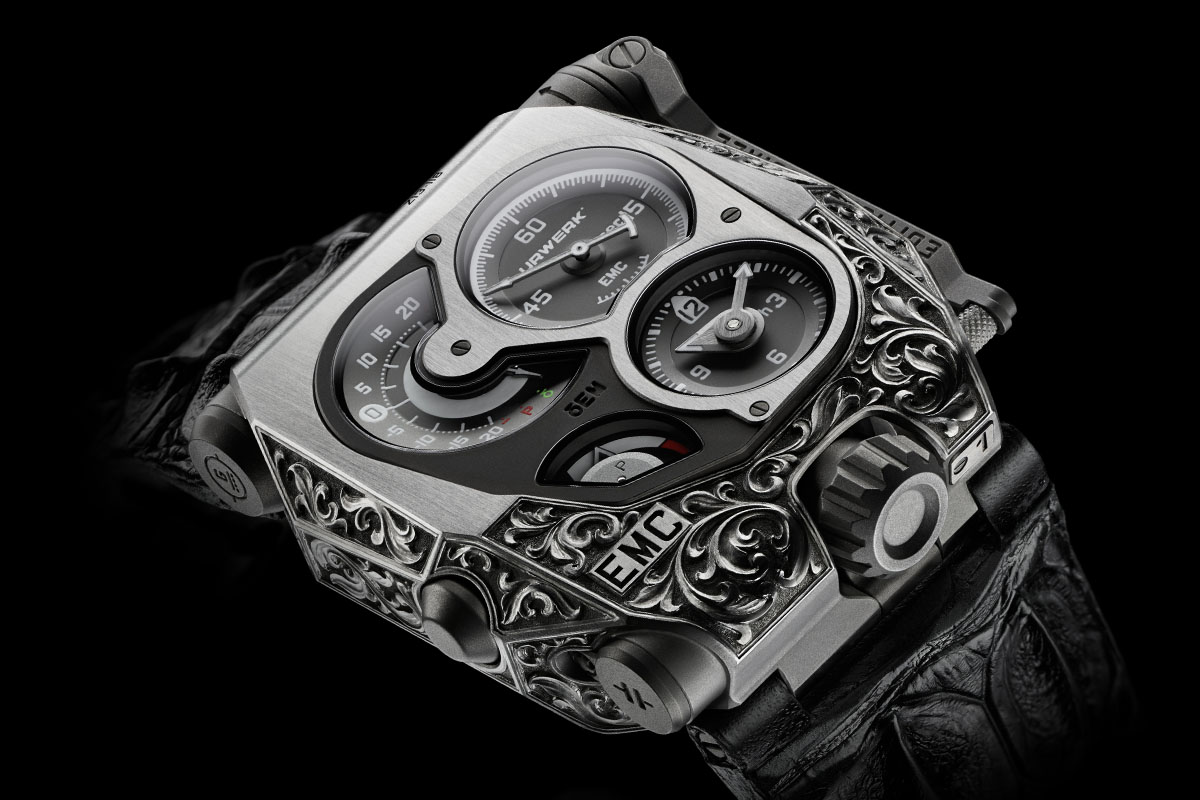 The Urwerk EMC – The Pistol has brought together the leading craftsmen and the most skilled hands to do justice to these five unique watches. Florian Güllert (specialized in engraving firearms) was responsible for the engraving, Joséphine and Sylviane (specialized in crafting high-grade leather straps) took care of the leather work for the strap while URWERK’s artistic director, Martin Frei, and master-watchmaker, Felix Baumgartner, have unstintingly given of their best to create this watch. The EMC Pistol is the fruit of this exceptional alliance.