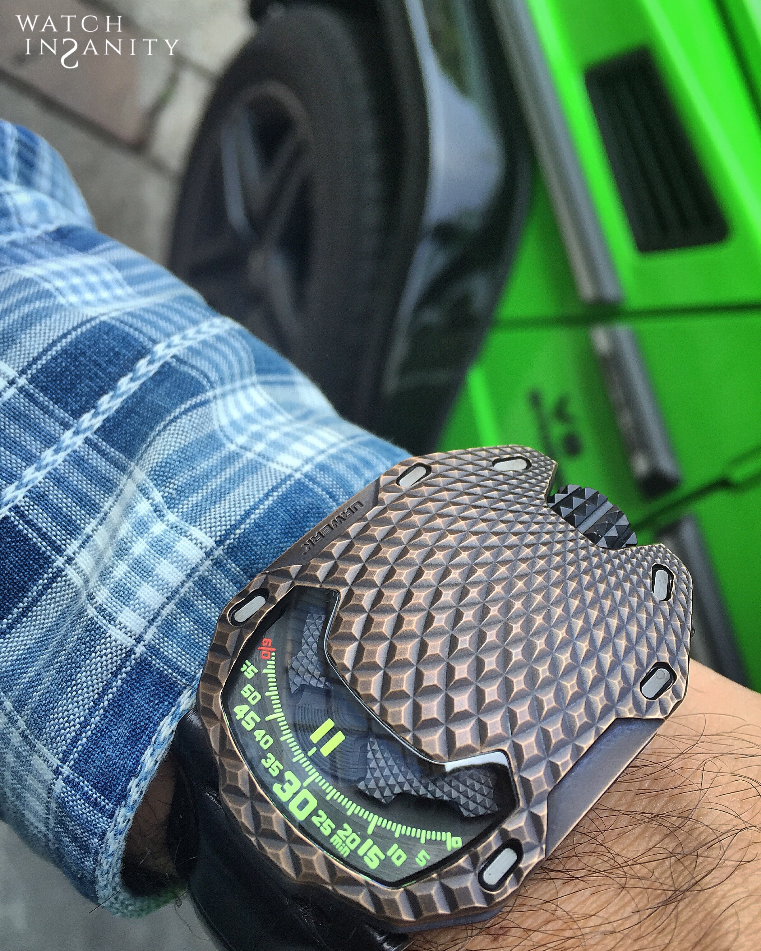 The bronze case with concentric ribbed patterns, and the minute line colored with the Urwerk’s classic yellow fluo, where the satellites display the hours makes this timepiece a true monster watch! In the beginning it was not an easy watch to wear… a true beast to tame on the wrist.